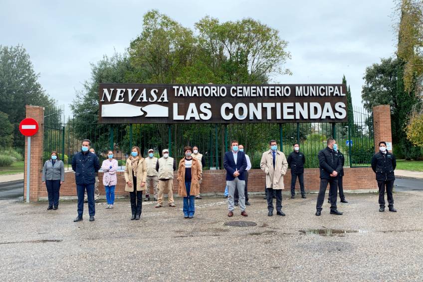 La concejala de Medio Ambiente y presidenta del Consejo de Administración de Nevasa, María Sánchez, junto a su gerente, Santos González, y trabajadores de la empresa municipal de servicios funerarios, se han unido al minuto de silencio convocado por la Asociación...