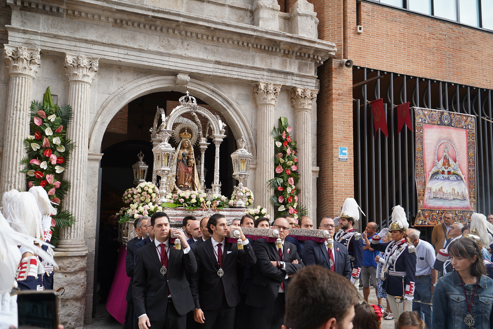 El día grande de la Feria y Fiestas de Valladolid incluye la celebración de la misa en la Catedral, oficiada por el arzobispo, Luis Argüello, y el regreso de la Procesión -las andas de la imagen son portadas a hombros por los cofrades- por la alfombra de la Plaza Mayor, realizada con más de 4.200 kilos de marmolinas y arenas.