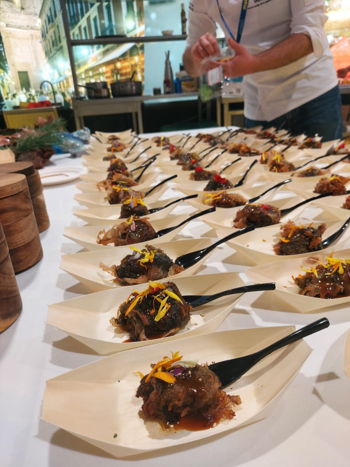 Los restaurantes La Teta y La Luna y Verde Oliva han sido los encargados de las tapas que se han ofrecido a lo largo de la jornada del miércoles. La Teta y la Luna ha ofrecido "Marbacoa", Pincho de Cobre 2021 en el Concurso Provincial de Pinchos; y que se compone un bollo al vapor relleno de cuellos de lechazo, envuelto en lechuga de mat y lacado con salsa barbacoa especial.