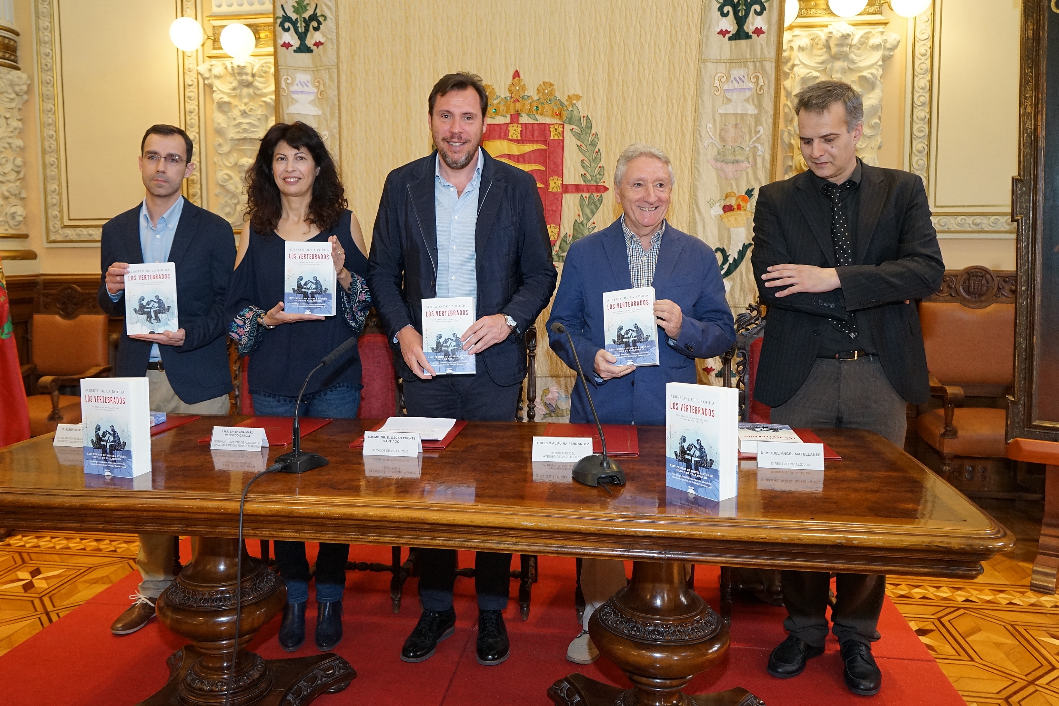 El alcalde de Valladolid, Óscar Puente, presentó hoy, en el Salón de Recepciones, la novela ganadora del Premio Ateneo-Ciudad de Valladolid que en esta ocasión ha recalado en el libro "Los vertebrados" del escritor Alberto de la Rocha.