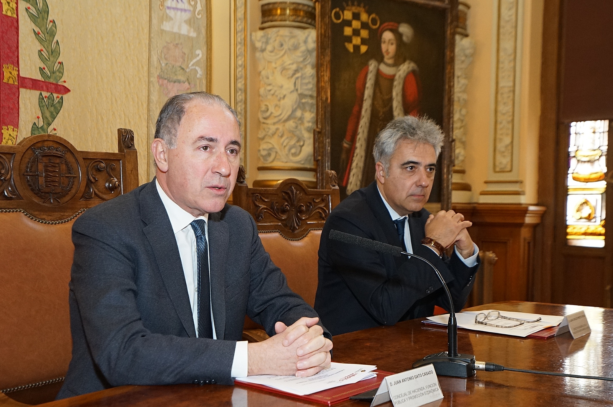 El concejal de Hacienda y Promoción Económica del Ayuntamiento de Valladolid, Antonio Gato, y el director general de la Fundación Santa María la Real, Juan Carlos Prieto, han presentado hoy el Convenio de colaboración por el que ambas entidades se comprometen a reforzar su lucha contra el paro en Valladolid con la puesta en marcha de cinco nuevas Lanzaderas de Empleo.