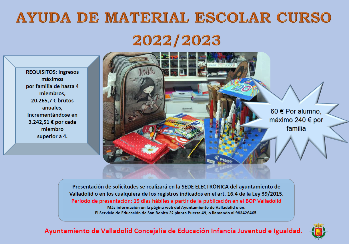 CONVOCATORIA PÚBLICA PARA LA CONCESIÓN DE AYUDAS A LAS FAMILIAS PARA LA ADQUISICIÓN DE MATERIAL ESCOLAR PARA LOS ALUMNOS QUE CURSEN ESTUDIOS DE 2º CICLO DE EDUCACIÓN INFANTIL, ED. PRIMARIA Y ED. SECUNDARIA OBLIGATORIA DURANTE EL CURSO 2022/2023 EN LOS CENTROS EDUCATIVOS DE LA CIUDAD DE VALLADOLID.