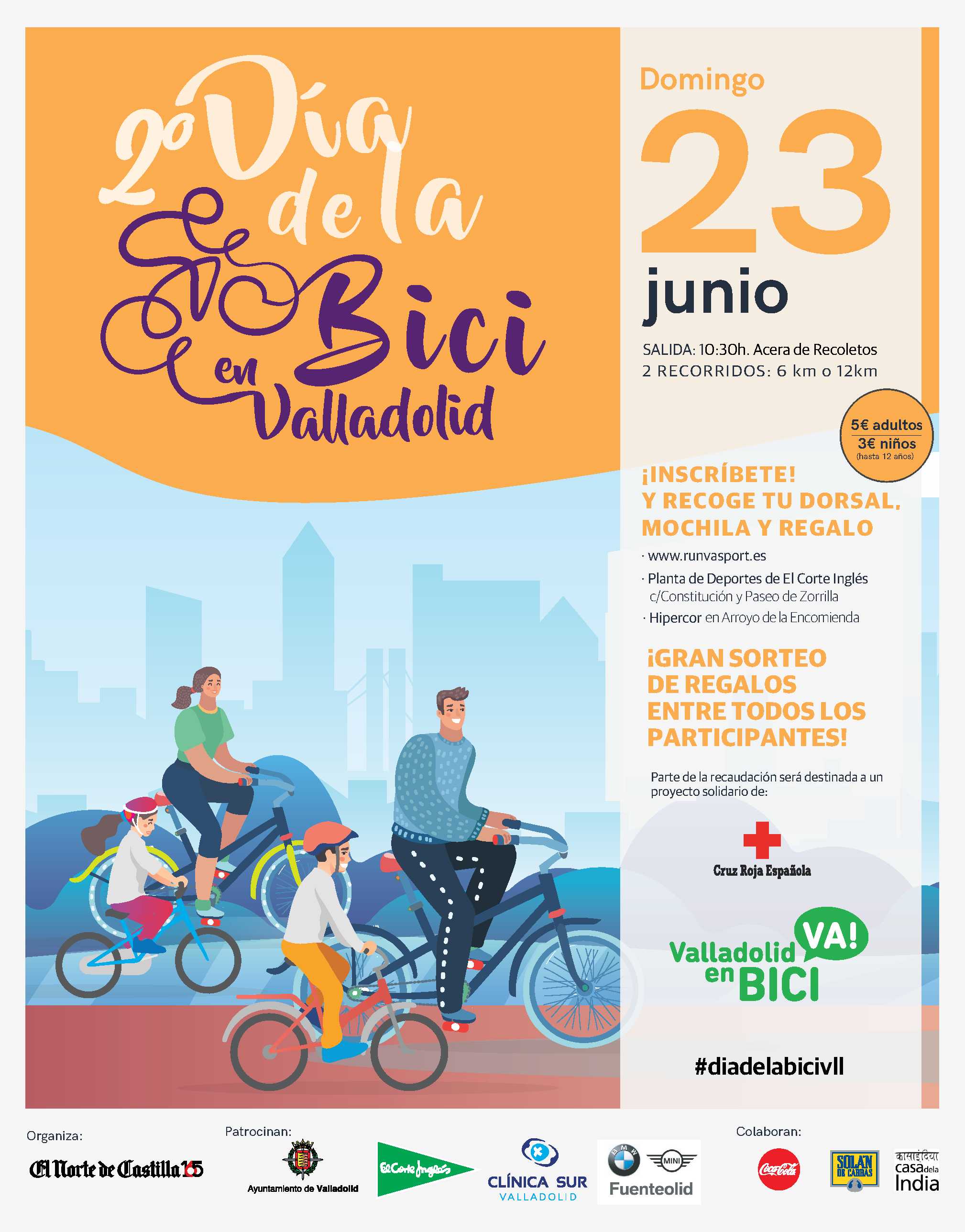 Las inscripciones para el 2º Día de la Bici que tienen un precio de 5 euros para los adultos y 3 para niños hasta 12 años, se pueden formalizar a partir del 24 de mayo en la web www.runvasport.es y a partir del 3 de junio de manera presencial en la Planta de Deportes de El Corte Inglés en calle Constitución y Paseo de Zorrilla y en Hipercor de Arroyo de la Encomienda. La fecha límite para inscribirse es el 22 de junio a las 20 horas.