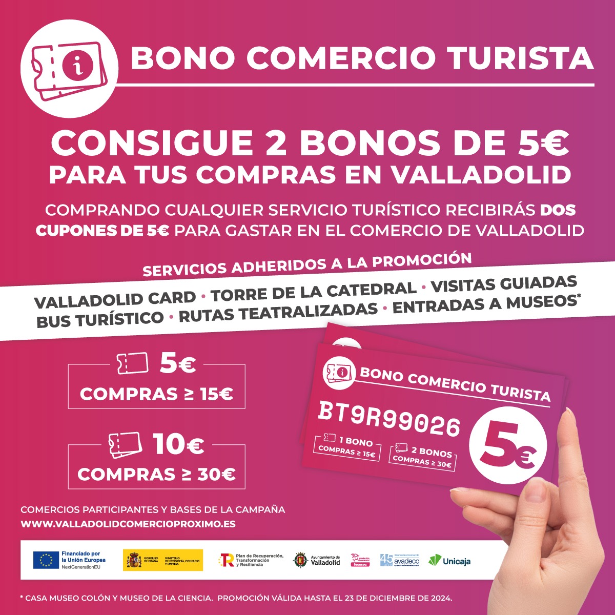 La campaña "BONO COMERCIO TURISTA" se pone en marcha mañana día 22 hasta el 23 de diciembre, con el objetivo de acercar a los turistas y visitantes al comercio local y seguir fomentando el comercio minorista de proximidad. Se trata de una iniciativa del Ayuntamiento de Valladolid a través de su Concejalía de Comercio, Mercados y Consumo, con la colaboración de FECOSVA y AVADECO, que estará cofinanciada con fondos europeos NEXT GENERATION-EU en el marco del Plan de Recuperación, Transformación y Resiliencia, y que cuenta con la colaboración de Unicaja Banco en Valladolid como entidad financiera de gestión.