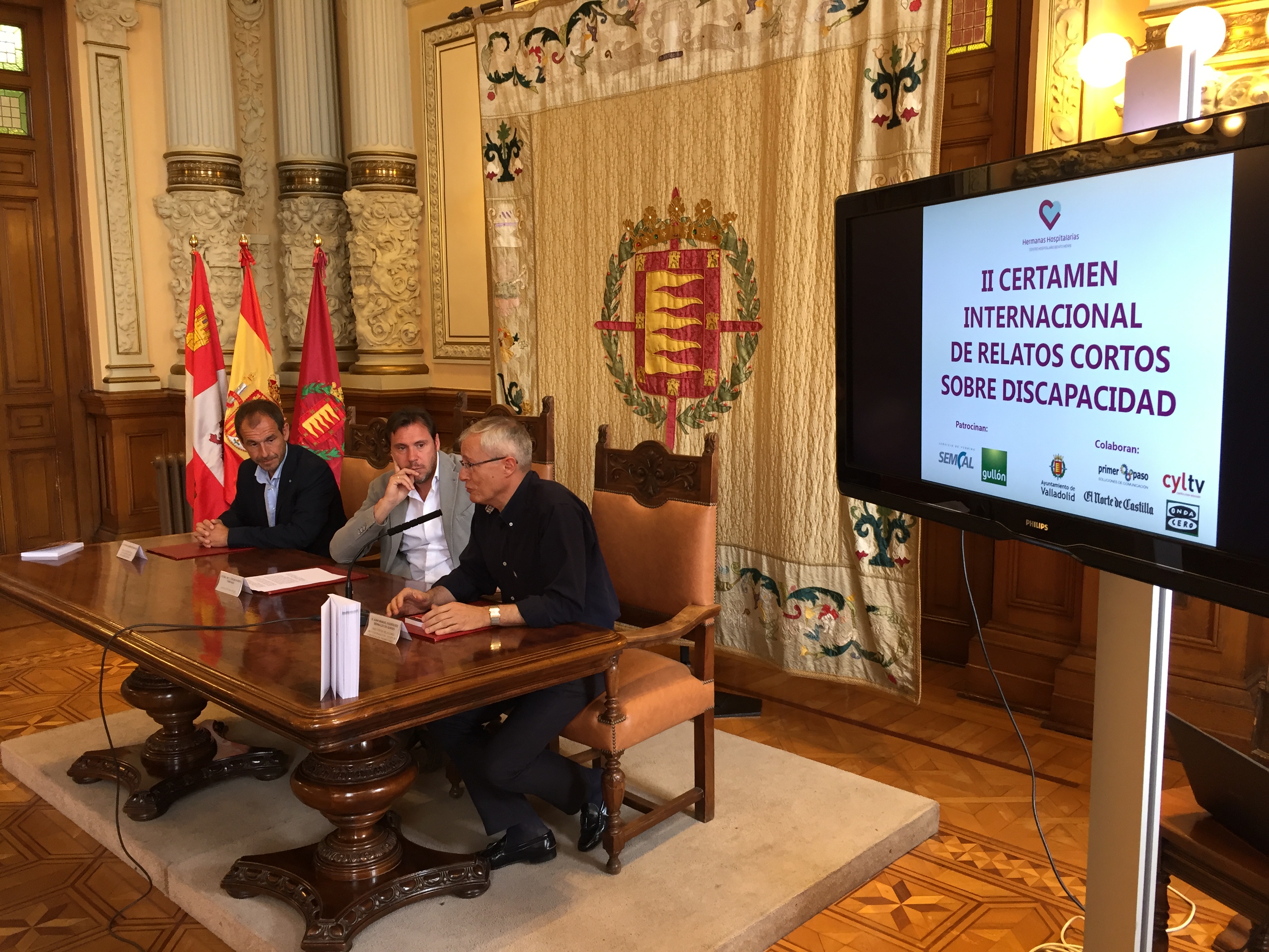 El alcalde de Valladolid, Óscar Puente; el Director Gerente del Centro Hospitalario Benito Menni de Valladolid, Antonio Rodríguez, y el Director de Relaciones Institucionales del Grupo de Comunicación Primer Paso, Juan Manuel Rodriguez, han presentado en el Ayuntamiento de Valladolid, el "II Certamen Internacional de Relatos Cortos sobre discapacidad" en lengua castellana.