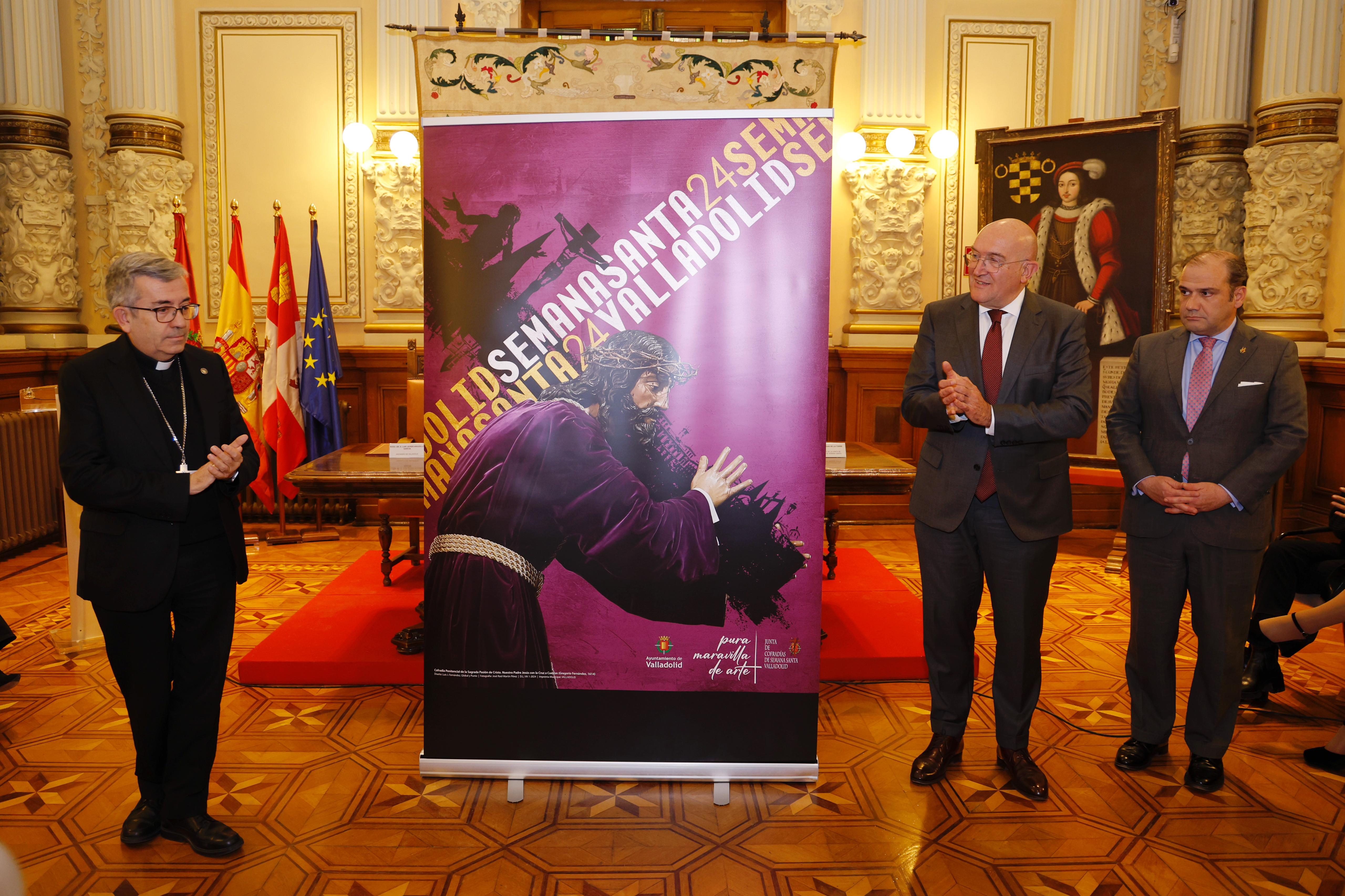 El alcalde, Jesús Julio Carnero, y el presidente de la Junta de Cofradías de Semana Santa de Valladolid, Miguel Vegas, acompañados por el arzobispo de Valladolid, D. Luis Argüello, han presentado en el Salón de Recepciones del Ayuntamiento el cartel anunciador de la Semana Santa vallisoletana, que ilustrará una imagen de Jesús con la Cruz a Cuestas, obra de Gregorio Fernández, captada por la cámara de José Raúl Martín Pérez, uno de los fotógrafos oficiales de la Semana Santa de Valladolid, durante la procesión de la Oración y Sacrificio del Jueves Santo celebrada el pasado año, en la que procesiona desde el año 2014.