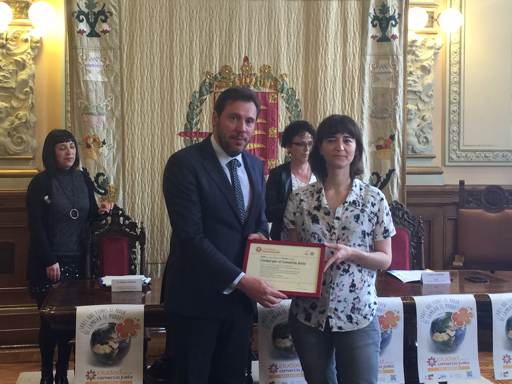 La ONG "IDEAS", entidad certificadora del sello de Ciudad por el Comercio Justo, hizo entrega este viernes de dicho reconocimiento al alcalde de Valladolid, Oscar Puente, en un acto celebrado en la Casa Consistorial al que asistieron la concejala de Servicios Sociales, Rafaela Romero, la vicepresidenta de la Coordinadora de ONG Castilla y León y representante de la ONG de Comercio Justo IDEAS.