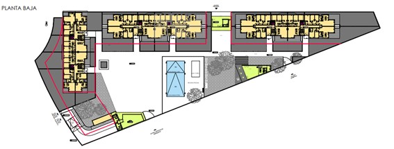 Se trata de un conjunto residencial formado por 3 edificios, con 28 viviendas cada uno, y zonas comunes ajardinadas.
