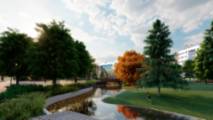 Se pretende crear diferentes ambientes: unos estanciales otros de paseo, unos con sombra y otros para el disfrute del sol. El arbolado se dispone con esta intención, con grupos de diferentes especies, apoyándose en los bordes y en los caminos. El agua estará presente visualmente y desde la pradera se podrá llegar a tocarla lo que supondrá un refresco en los días de verano.