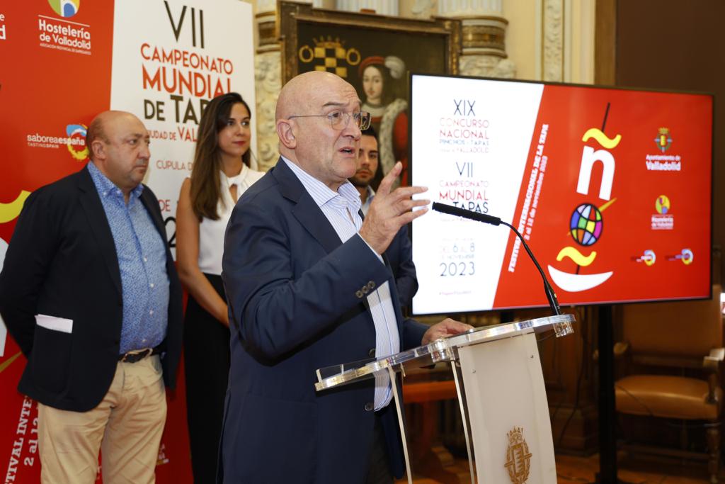 El alcalde, Jesús Julio Carnero, ha presentado hoy la XIX edición del Concurso Nacional de Pinchos y Tapas y el VII Campeonato Mundial de Tapas Ciudad de Valladolid que organiza el Ayuntamiento de Valladolid a través de la Sociedad Mixta de Turismo, junto a los directores técnicos de ambos concursos, Luis Cepeda y Ángel Moretón, respectivamente, y el presidente de la Asociación de Hostelería de Valladolid, Jaime Fernández.