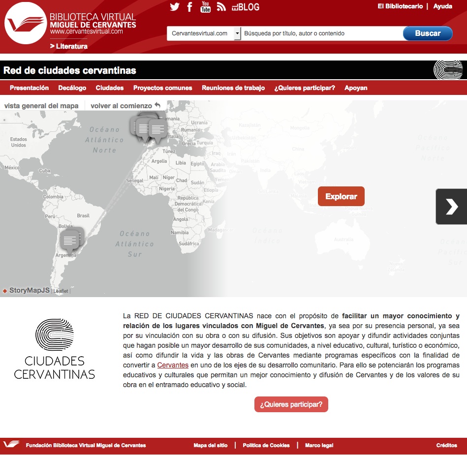 Para poder mantener una comunicación entre los componentes de la Red de Ciudades Cervantinas y dar a conocer sus actividades y proyectos cervantinos, se ha creado una portal digital, dentro de la más visitada plataforma digital en español: la Biblioteca Digital Miguel de Cervantes: http://www.cervantesvirtual.com/portales/red_ciudades_cervantinas/