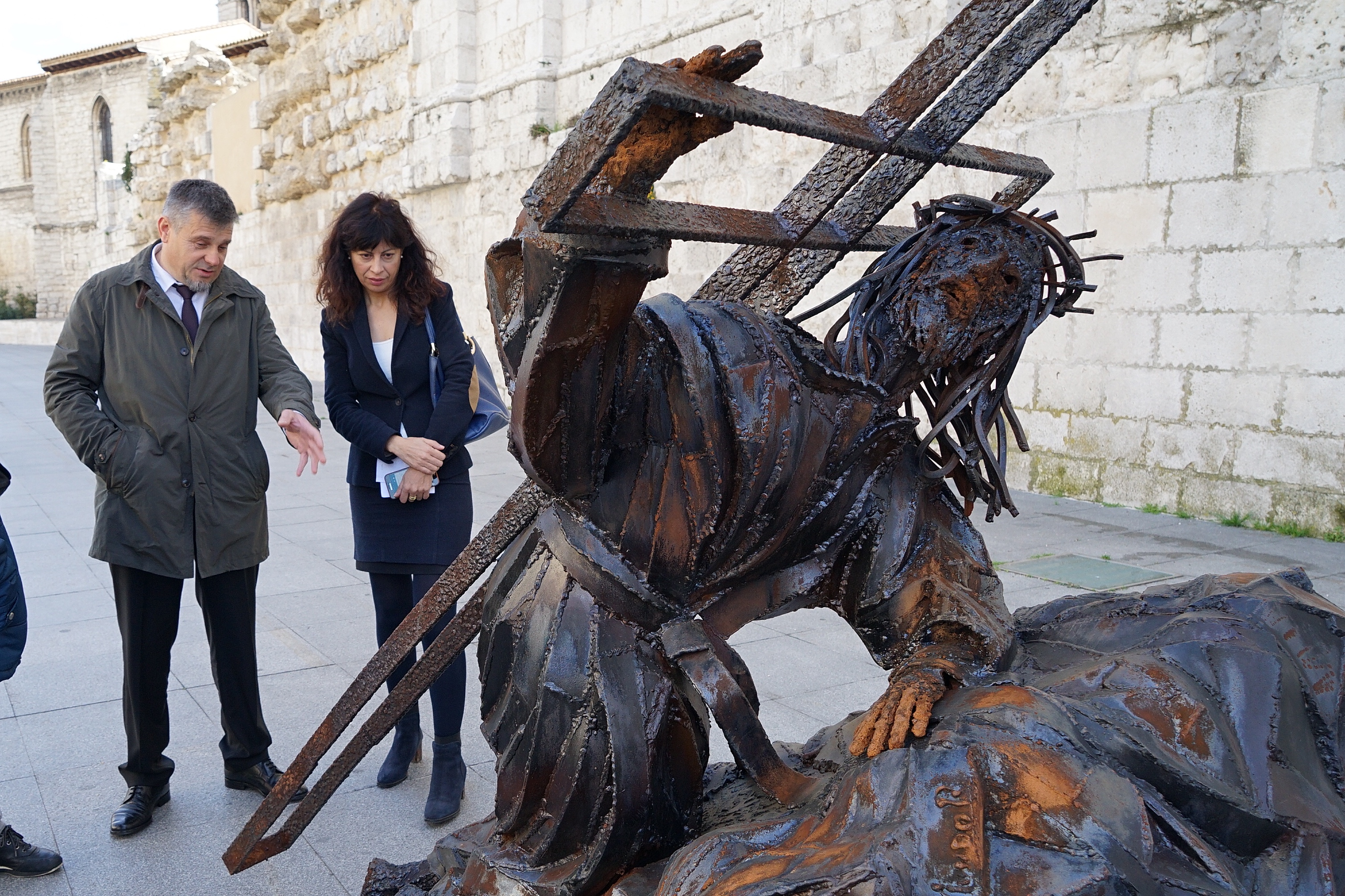 La concejal de Cultura y Turismo del Ayuntamiento de Valladolid, Ana María Redondo; el obispo auxiliar de la Diócesis, Luis Javier Argüello; el presidente de la Junta de Cofradías de Valladolid, Felipe Esteban; acompañados de Raimundo Rubal Nogueira, autor de las obras, han asistido hoy en la Plaza de Portugalete a la inauguración de la exposición de esculturas al aire libre que bajo el título de la "Redención del Hombre", permanecerá instalada para su contemplación hasta el próximo 16 de abril.
