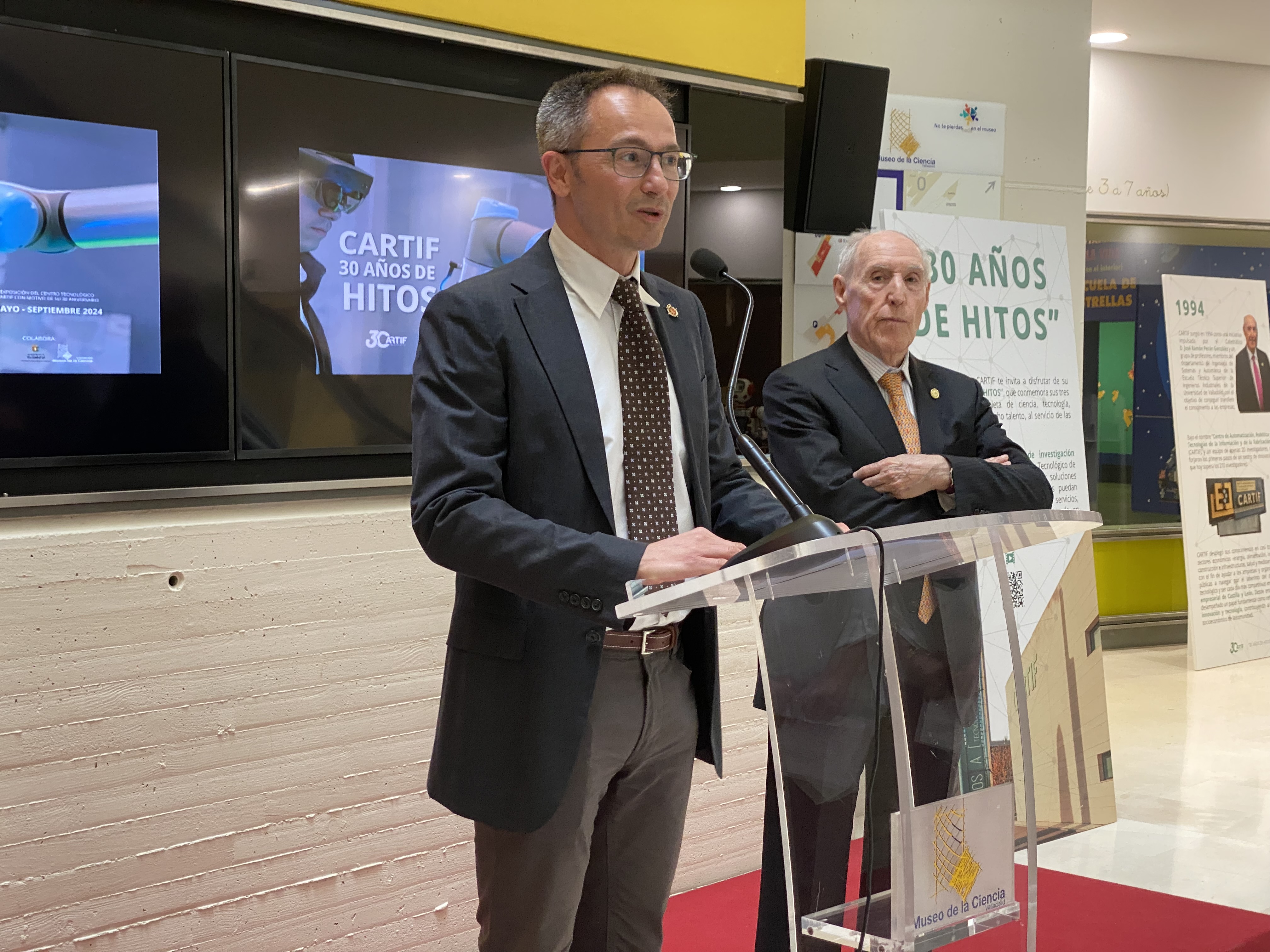 El concejal de Comercio, Mercados y Consumo, Víctor Martín, ha inaugurado hoy en el Museo de la Ciencia de Valladolid - Fundación Municipal de Cultura la exposición temporal ‘CARTIF, 30 años de hitos’. El acto ha contado también con la presencia de la directora del Museo de la Ciencia, Inés Rodríguez Hidalgo; el director general de CARTIF, José R. Perán González, y el subdirector general de CARTIF, Sergio Sanz.