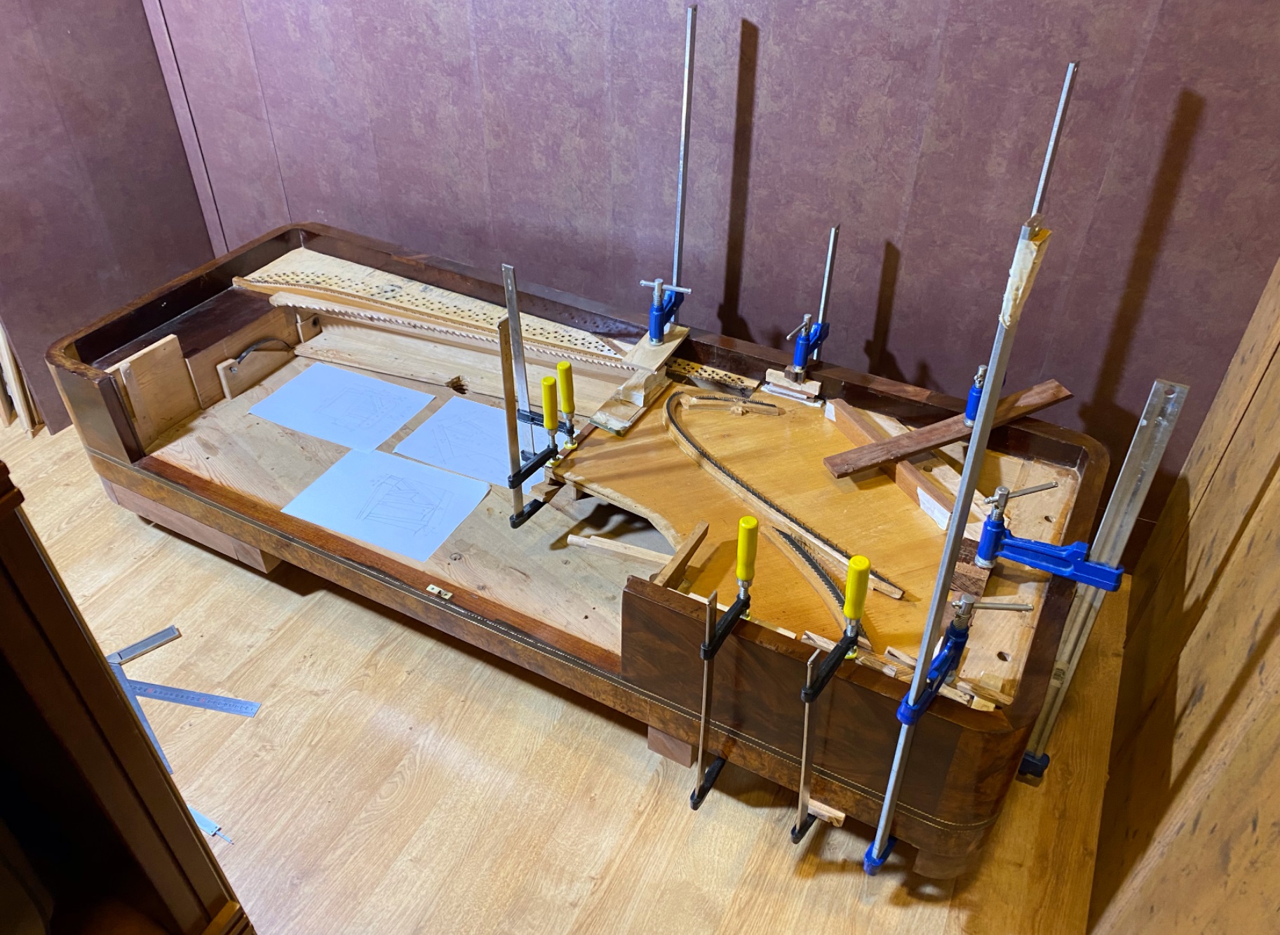 Foto restauradorFoto restauradorLa estructura del instrumento ha sido consolidada, encolando con cola de nervios aquellas "costillas o viguetas" que con el paso del tiempo se han combado, desplazado o despegado de su lugar de origen. Se han eliminado aquellas partes no originales, y gracias a las marcas en la madera, se ha devuelto al instrumento su aspecto original, dotado de cajoneras laterales chapadas en palma de caoba. La ornamentación, muy dañada, a base de lazos de hilos de latón de 1,5 mm de grosor, ha sido insertada minuciosamente y encolada con pasta de polvo de caoba y cola de conejo. Se han restaurado numerosas faltas de chapa de raíz, palma de caoba y chapa de caoba. Las roscas de madera en chambrana y patas, fuertemente dañadas, han sido restauradas, consiguiéndose la estabilidad del cuerpo del instrumento.