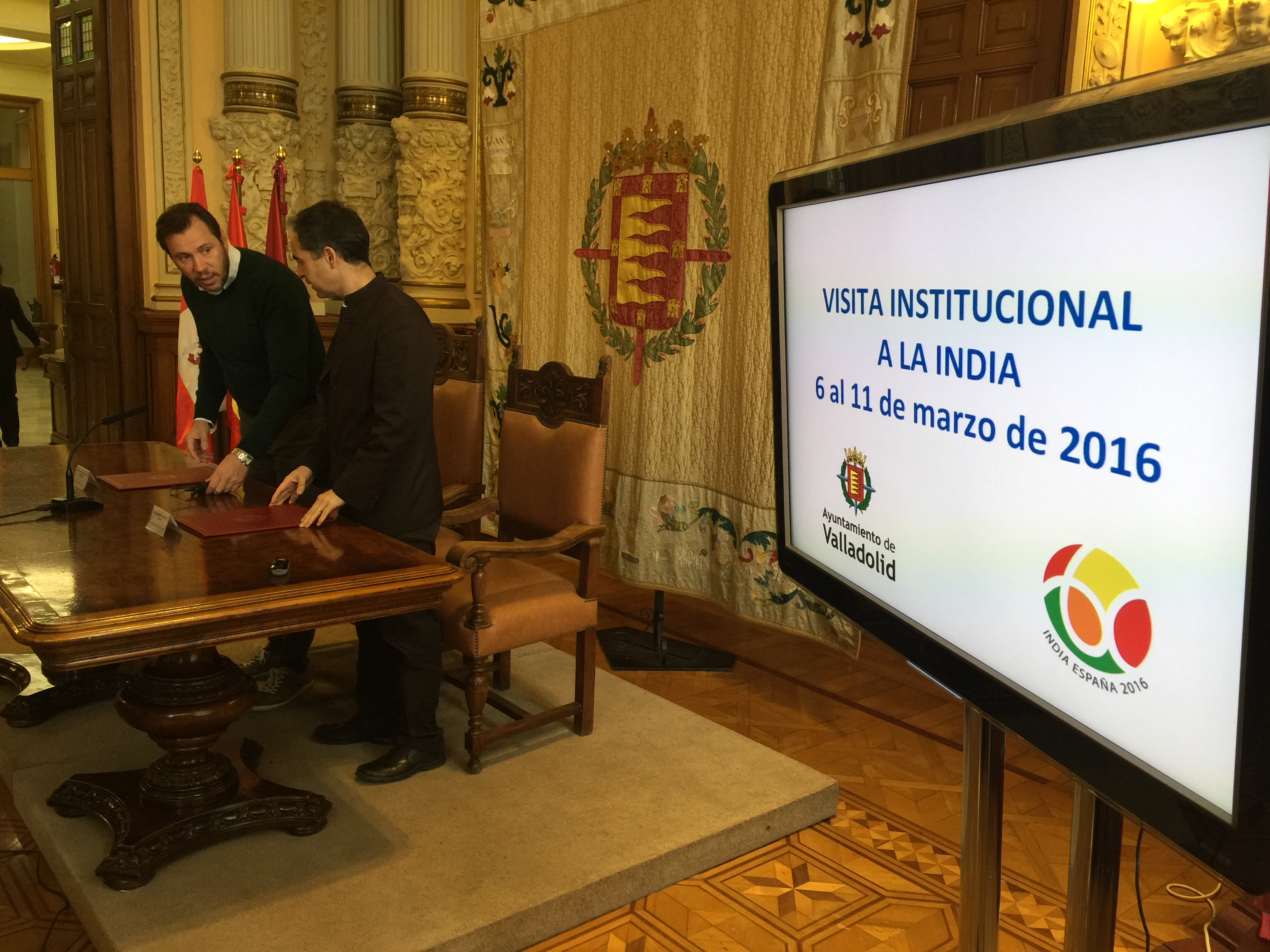 El alcalde de Valladolid, Oscar Puente, y el director de Casa de la India, Guillermo Rodríguez, comparecieron esta mañana en el Ayuntamiento para rendir cuentas del viaje que entre los días 5 y 11 de marzo realizó una delegación municipal a las ciudades de Nueva Delhi, Ahmedabad y Bombay.