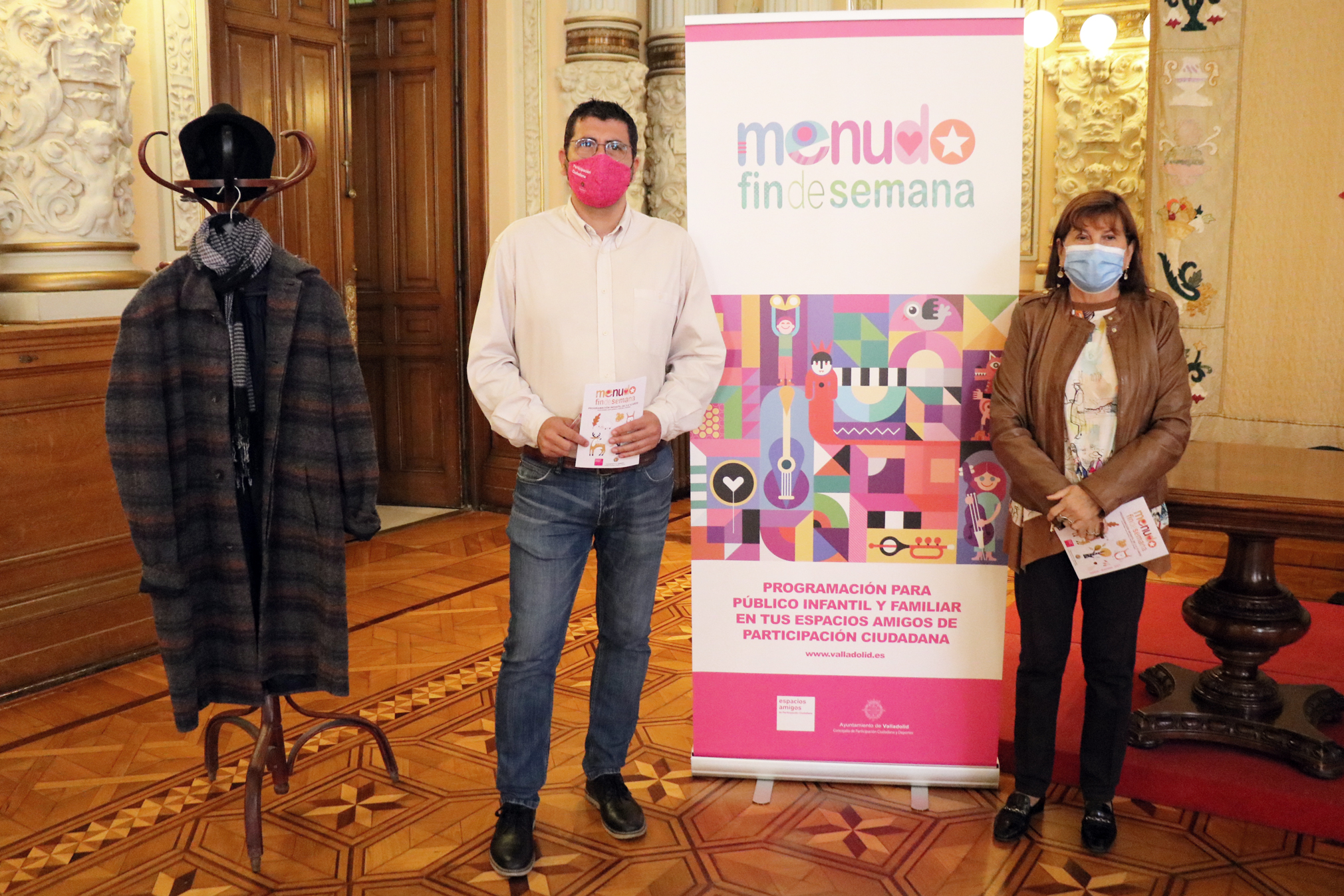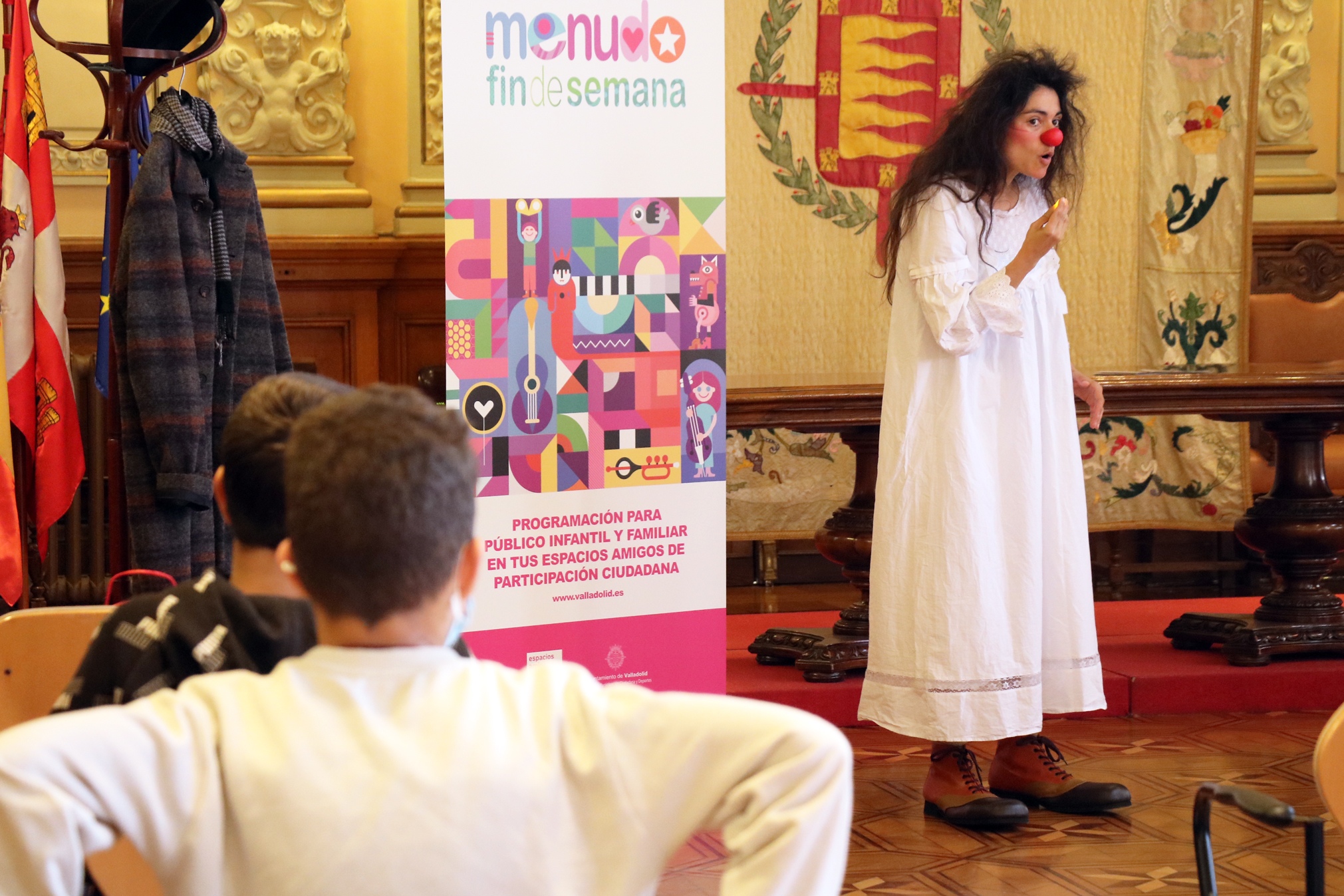 La concejala de Educación, Infancia, Juventud e Igualdad, María Victoria Soto, y el concejal de Participación Ciudadana y Deportes, Alberto Bustos, han presentado la nueva programación de Menudo Fin de Semana, acto al que ha acudido una representación de alumnos y alumnas del CEIP Cristóbal Colón y que ha contado como cierre con la actuación de la compañía vallisoletana multidisplicinar de clown, teatro y circo, Luciérnaga Teatro.