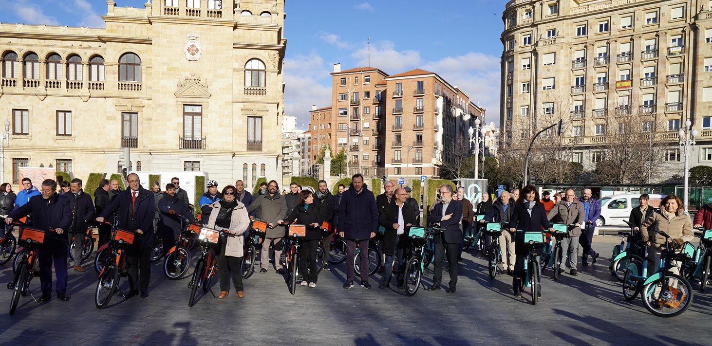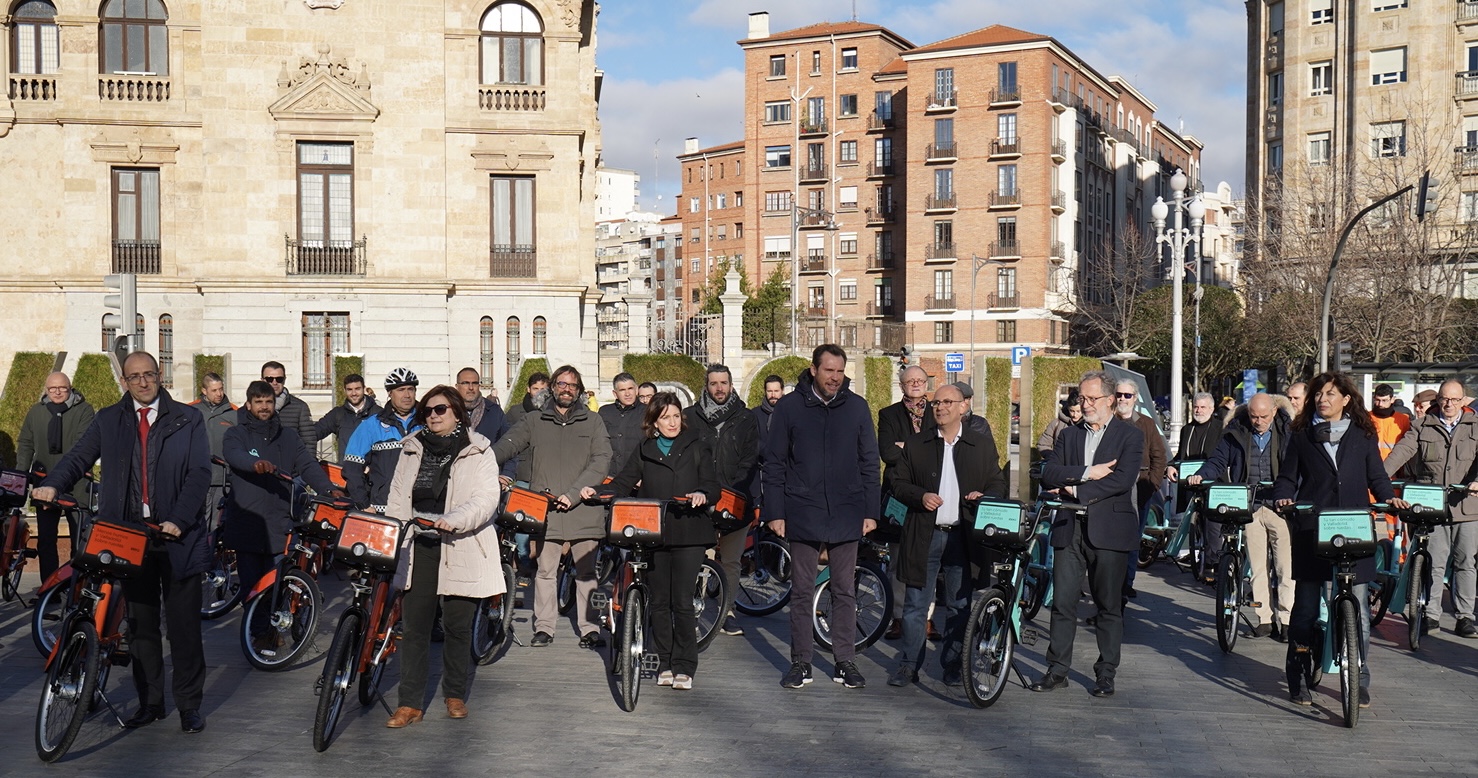 El alcalde de Valladolid, Oscar Puente, el concejal de Movilidad y Espacio Urbano, junto con gran parte del Equipo de Gobierno y el gerente de AUVASA, Álvaro Fernández, han presentado el nuevo servicio de alquiler público de bicicleta BIKI junto a representantes de instituciones y diferentes colectivos de la ciudad.