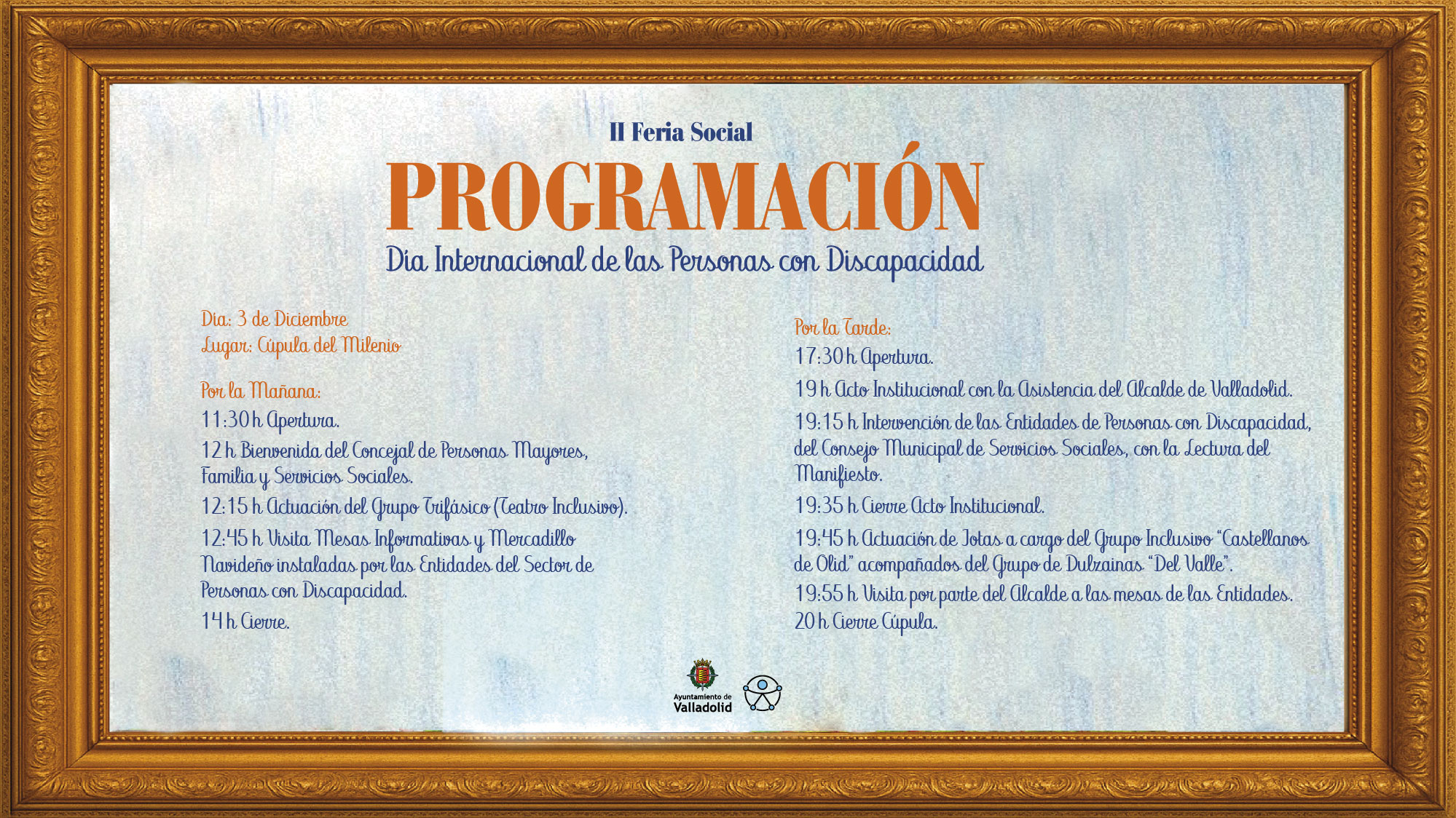 El acto institucional tendrá lugar por la tarde a las 19:00 horas, a cargo del alcalde de Valladolid, Jesús Julio Carnero, y contará con la intervención de las entidades de personas con discapacidad del Consejo Municipal de Servicios Sociales, que leerán el Manifiesto del Día Internacional. Entre otras actividades programadas, el público podrá disfrutar de la actuación del grupo de teatro inclusivo ‘Trifásico’.