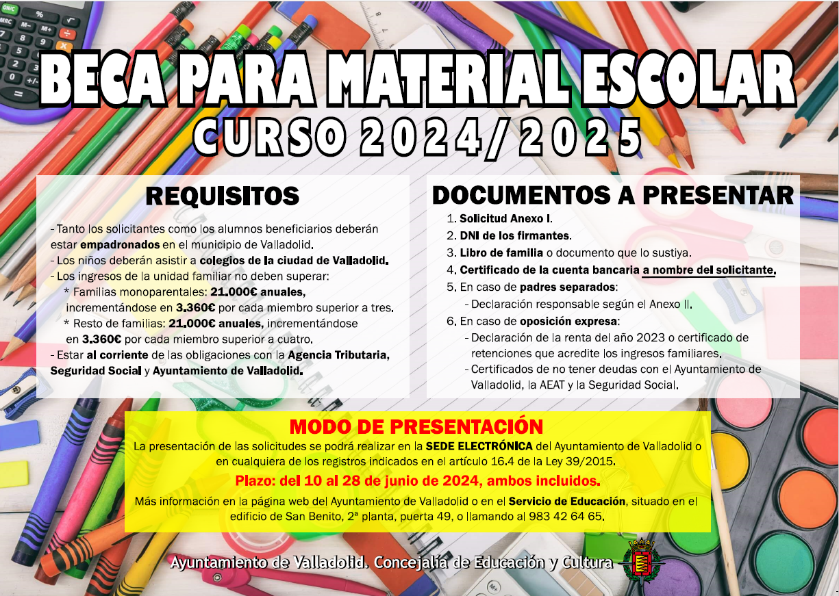 Por decreto nº 8389, de 14 de noviembre de 2024, firmado por la Concejala Delegada de Educación y Cultura, se ha resuelto la concesión provisional de becas para material escolar destinado a alumnos de segundo ciclo de educación infantil, primaria y secundaria del curso escolar 2024/2025.