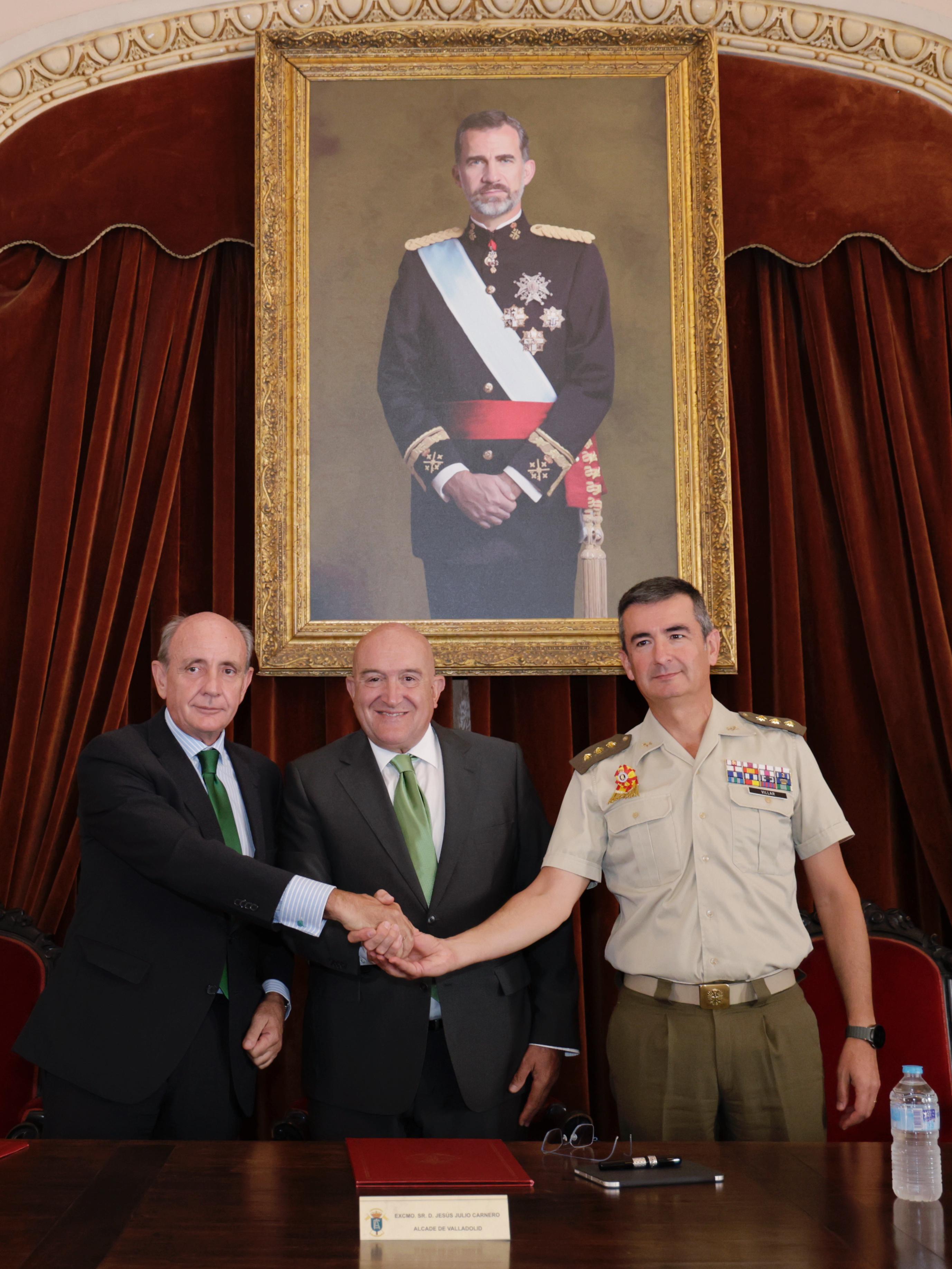 El alcalde de Valladolid, Jesús Julio Carnero, y el director de la Fundación Iberdrola EspañaEste enlace se abrirá en una ventana nueva., Ramón Castresana, han suscrito esta mañana, en presencia del coronel director de la Academia de Caballería, Francisco Javier López Villar, y el delegado de Iberdrola en Castilla y León, Miguel Calvo, un convenio de colaboración para dotar de una nueva iluminación ornamental exterior la Academia de Caballería, uno de los edificios más representativos y majestuosos de la capital vallisoletana.