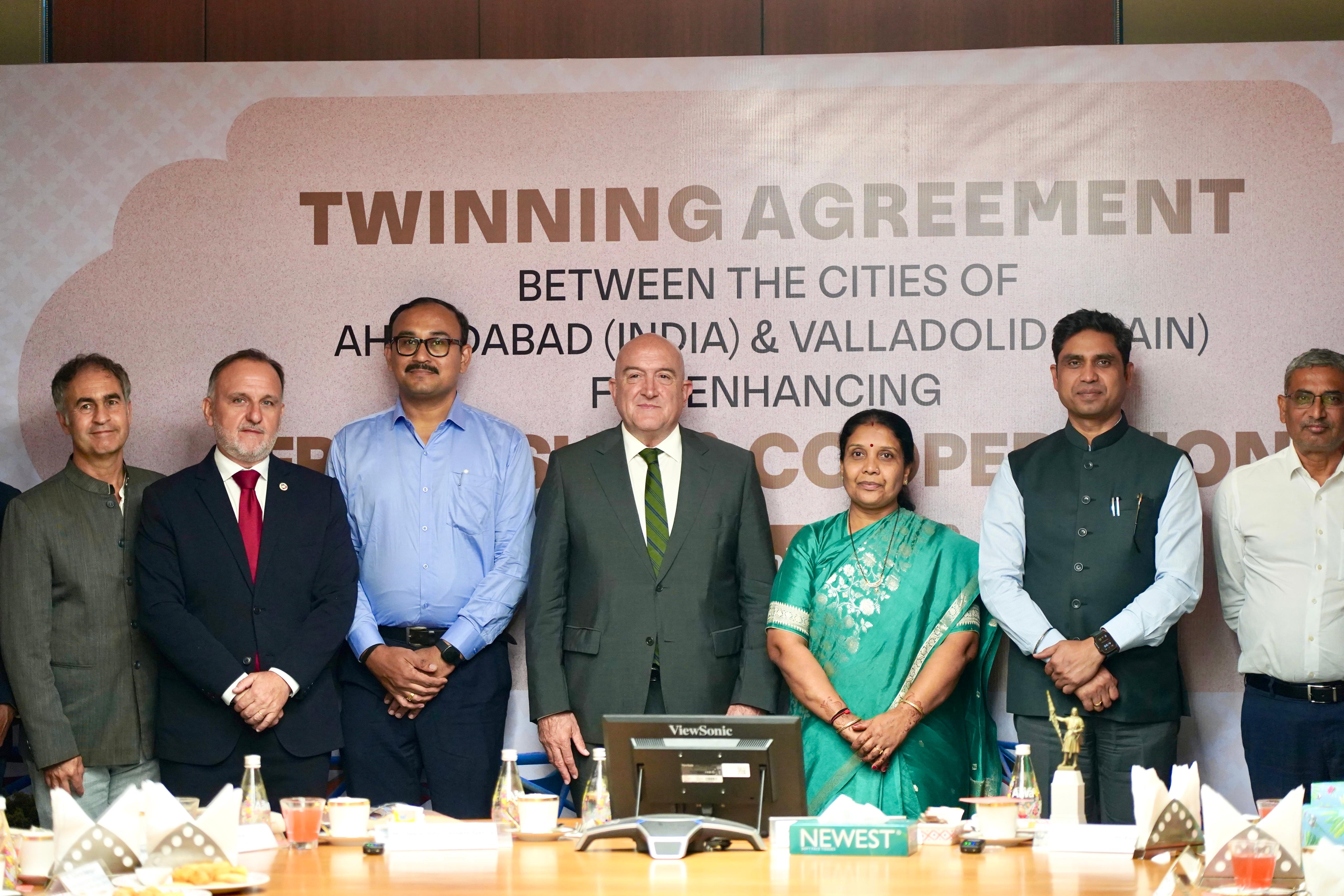- En primer lugar, el alcalde ha puesto en valor la renovación y ampliación del Protocolo de Hermanamiento que une Ahmedabad con Valladolid desde 2017. Este acuerdo, firmado junto a la alcaldesa de la ciudad asiática, Pratibhaben Jain, supone un nuevo impulso a la cooperación cultural, educativa, tecnológica y social entre dos comunidades que, pese a la distancia geográfica, comparten un fuerte compromiso con el patrimonio, la cultura, el turismo, la gastronomía, la inteligencia artificial, la innovación y el desarrollo sostenible.