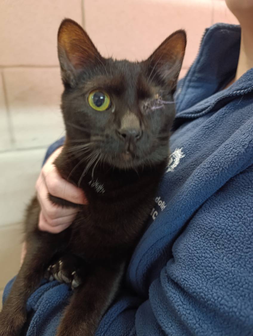 Es muy cariñoso y juguetón. Tiene un ojo enucleado.