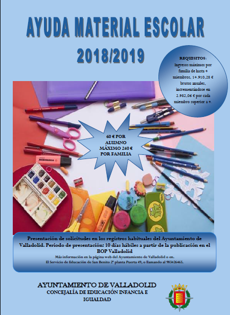 CONVOCATORIA PÚBLICA PARA LA CONCESIÓN DE AYUDAS A LAS FAMILIAS PARA LA ADQUISICIÓN DE MATERIAL ESCOLAR PARA LOS ALUMNOS QUE CURSEN ESTUDIOS DE 2º CICLO DE EDUCACIÓN INFANTIL, ED. PRIMARIA Y ED. SECUNDARIA OBLIGATORIA DURANTE EL CURSO 2018/2019 EN LOS CENTROS EDUCATIVOS DE LA CIUDAD DE VALLADOLID.
