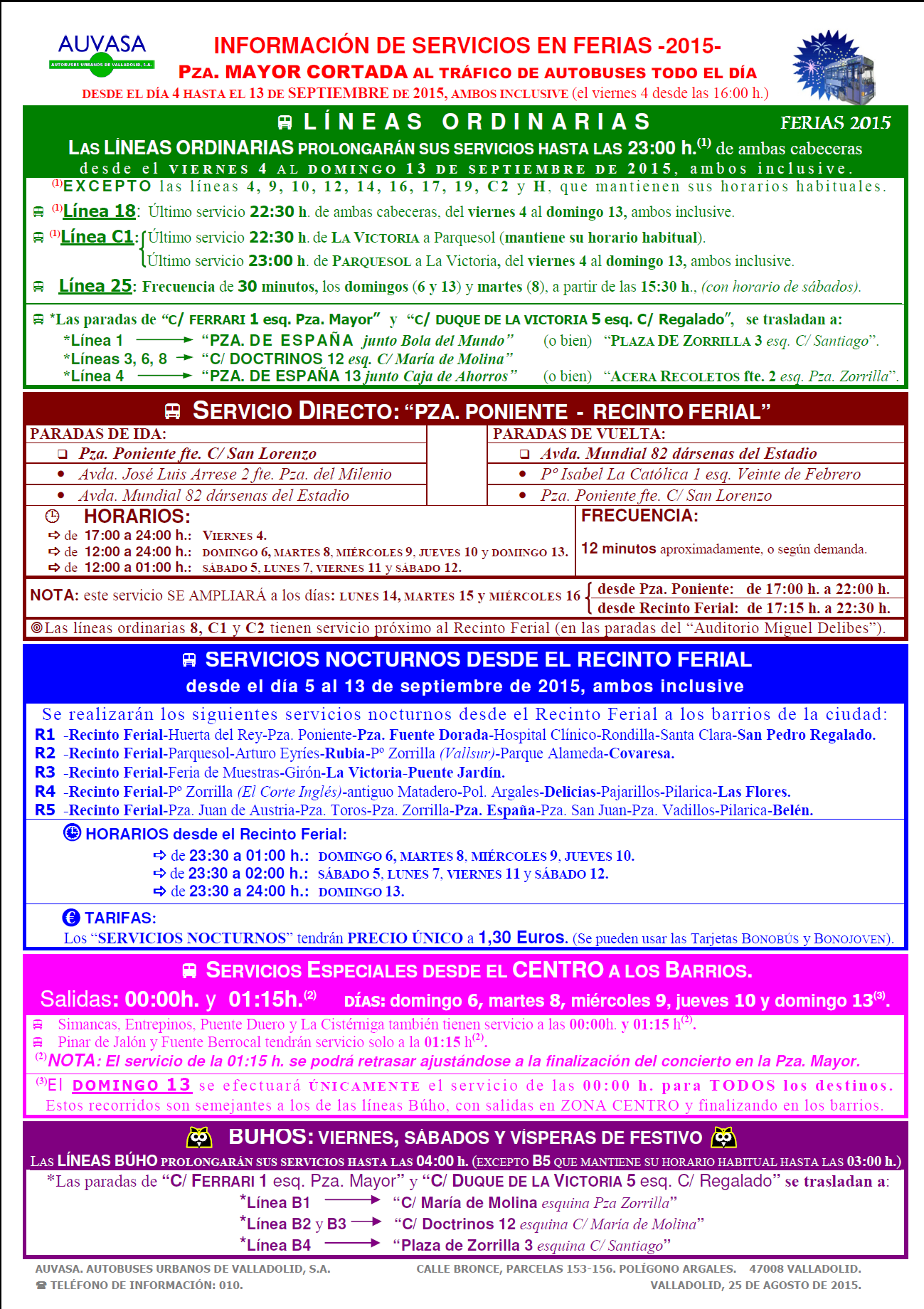 AUVASA informa a los viajeros ya en su página web http://www.auvasa.es/info/FERIAS_2015.pdf