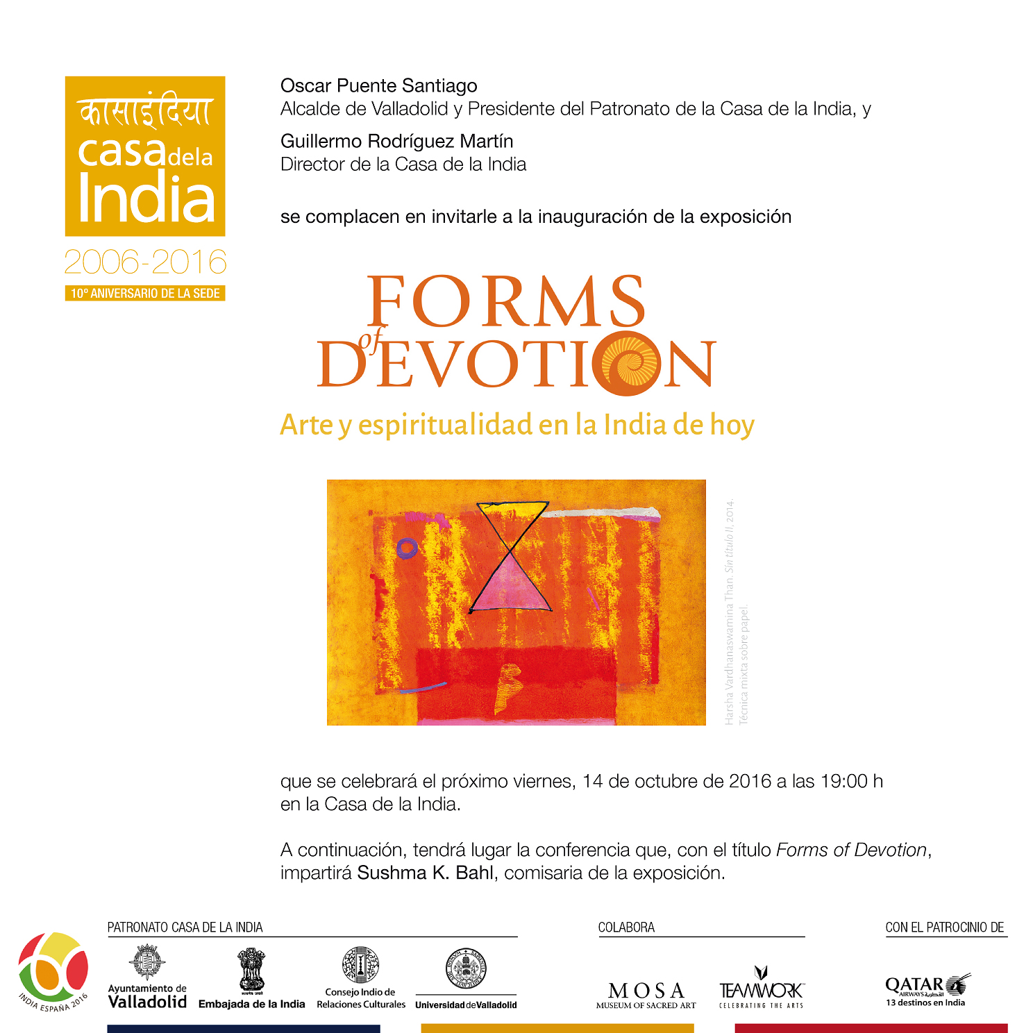 Esta exposición, que se enmarca dentro de la celebración de los 60 años de Relaciones Diplomáticas entre la India y España y del décimo aniversario de la sede de la Casa de la India, está organizada por la Casa de la India en colaboración con la Embajada de la India, ICCR (Consejo Indio de Relaciones Culturales), MOSA (Museo de Arte Sacro, Bélgica) y Qatar Airways.