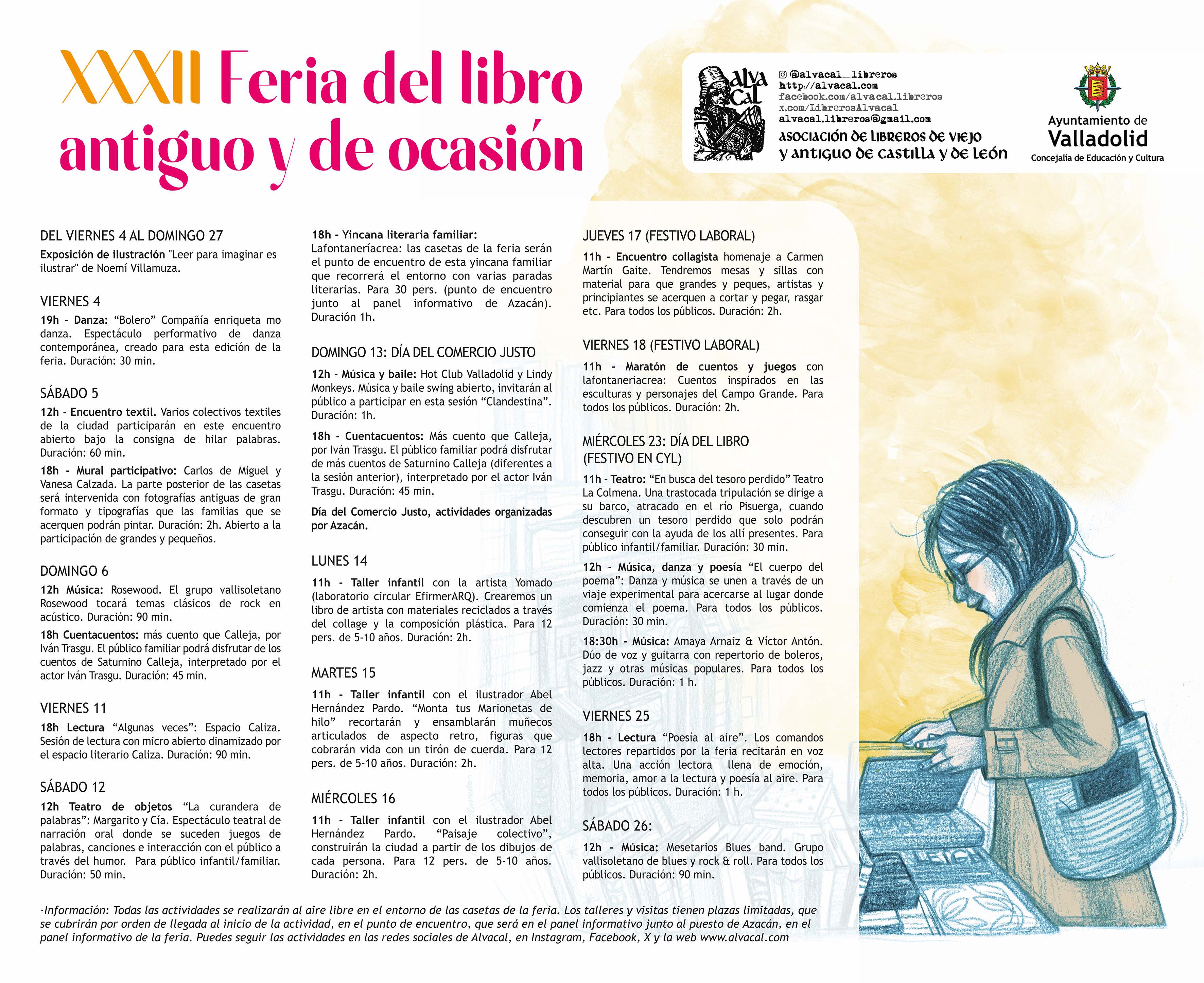 Como viene siendo habitual en los últimos años, la Concejalía de Educación y Cultura del Ayuntamiento de Valladolid colaborará ofreciendo numerosas actividades, entre las que destacan talleres, cuentacuentos, recitales de poesía, teatro y conciertos para toda la familia. Un programa extenso y variado que hace que, a día de hoy, sea la Feria del Libro Antiguo que más actividades culturales organiza de toda España.