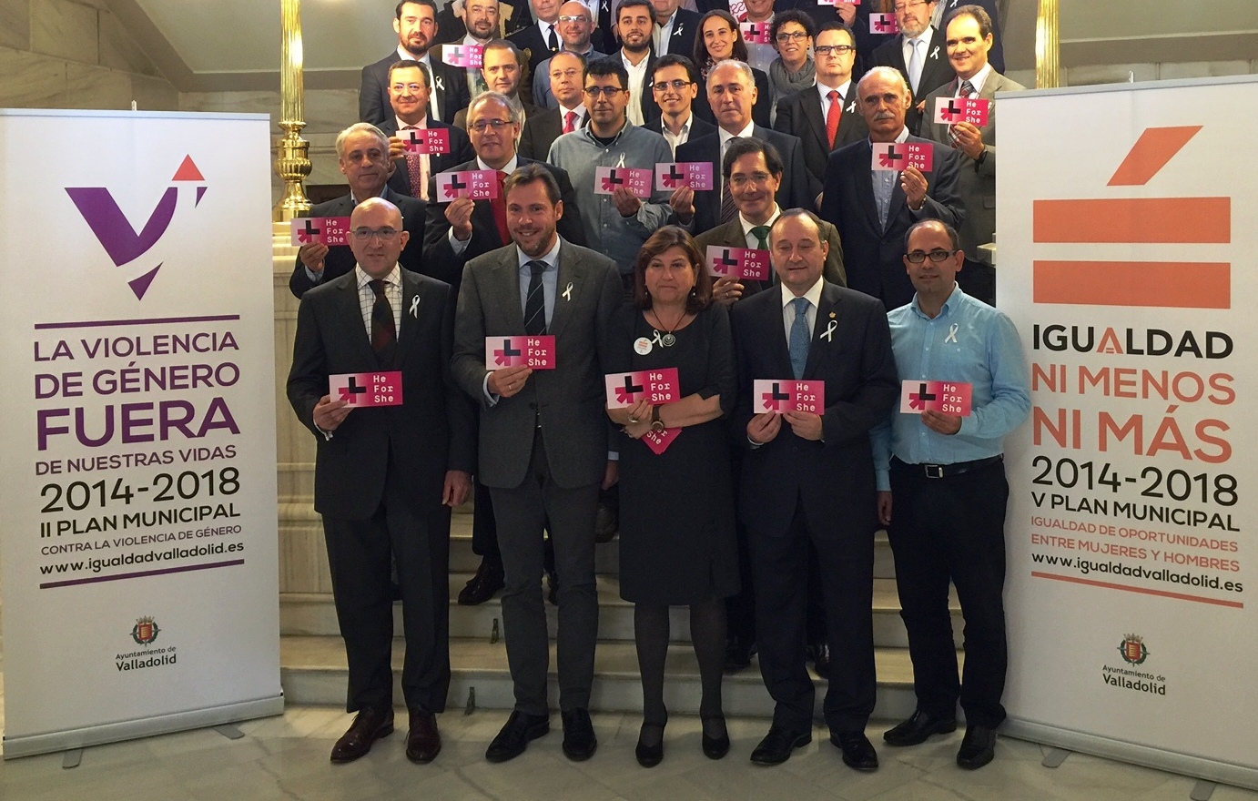 57 hombres, representantes de instituciones, empresas de comunicación, colectivos culturales y sociales de la ciudad, se unieron a los concejales varones de los Grupos Políticos Municipales, encabezados por el alcalde de Valladolid, Oscar Puente, en la adhesión a la Campaña de ONU-Mujeres "He for She", contra la violencia y los estereotipos de género.