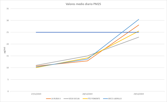 El Área de Medio Ambiente y Sostenibilidad del Ayuntamiento de Valladolid, informa que, según los datos suministrados por la Red de Control de la Contaminación Atmosférica de Valladolid, el día 29 de diciembre de 2019, la situación de contaminación atmosférica por partículas ha alcanzado valores por encima de los 25 µg/m3 de PM2,5 en tres estaciones de la RCCAVA, Arco ladrillo II, Rubia II y Puente Poniente.