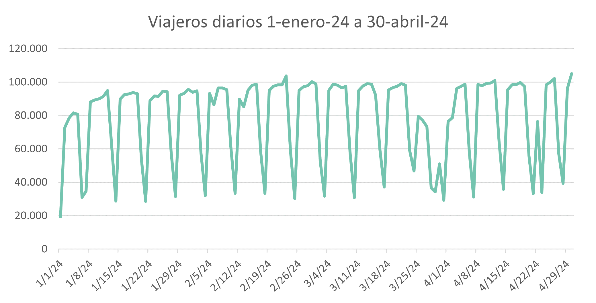 En este periodo se han registrado, igualmente, jornadas con valores superiores a los 100.000 viajeros, tanto en el mes de febrero, como en el mes de abril, con el 30 de abril como el día con más viajeros, 105.079.