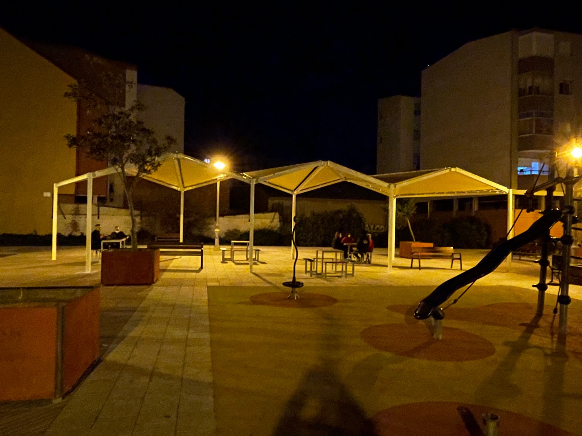 La actuación ha consistido en la instalación de dos marquesinas con cubierta textil, un total de 110 metros cuadrados, con mesas de recreo bajo ellas, acondicionando espacios de estancia en la plaza, teniendo por objetivo mejorar las condiciones de uso y disfrute de estos espacios.