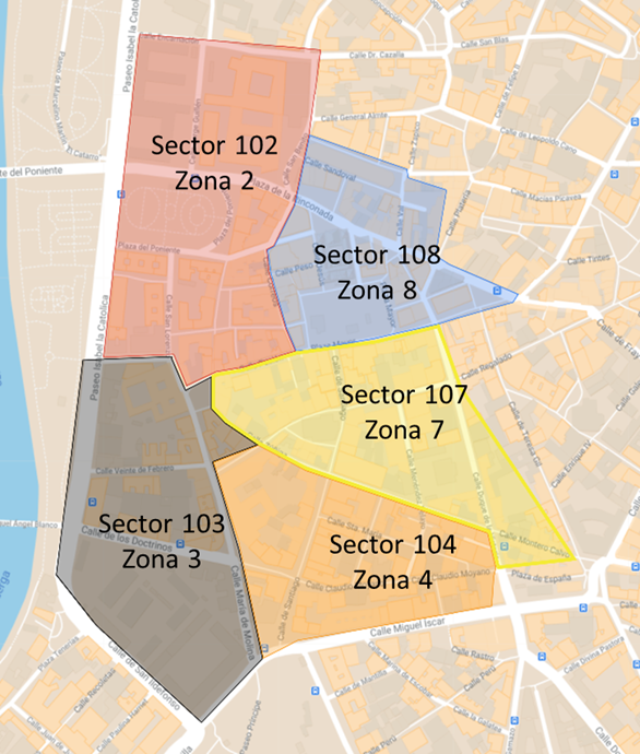 Por lo tanto, se dividirá la zona 1 en 5 Sectores (102, 103, 104, 107 y 108) y cada uno de ellos se asimilará a una zona de las actuales de residentes (2,3, 4, 7 y 8). De este modo, los residentes de cada Sector podrán estacionar en todas las plazas disponibles de la zona 1 y a su vez, en función de su Sector, en la zona de residente a la que se asimile.