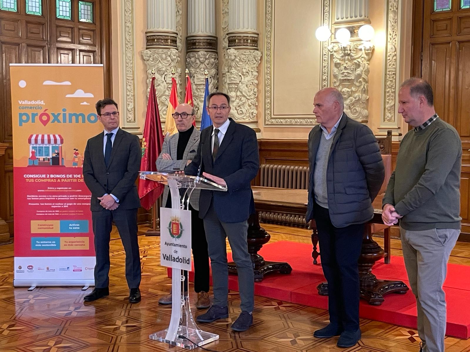 , en la que también se pueden consultar las bases generales de la campaña, así como la relación de los comercios participantes.El concejal de Comercio, Mercados y Consumo, Víctor Martín Meléndez; el presidente de AVADECO, Rafael Monedero Fernández; el presidente de FECOSVA, Jesús Herreras Revuelta; el vicepresidente de la Cámara de Comercio de Valladolid, Javier Labarga Vaca, y el director regional de Unicaja, José Manuel Motilla, han presentado hoy la campaña ‘Tu Bono Próximo-Primavera’, que se pondrá en marcha el próximo miércoles, 3 de abril, y se prolongará hasta el 8 de mayo, con el objetivo de apoyar y revitalizar las ventas en el pequeño comercio de Valladolid.