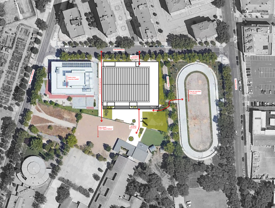 Este nuevo equipamiento, cuya inversión supera los 5 millones de euros, permitirá la construcción de una pista polideportiva cubierta, espacios auxiliares para deportistas, zonas singulares de apoyo y dependencias para el público. Todo ello en una parcela de 4.317 m², ubicada en Paseo del Jardín Botánico, nº4, esquina con la calle Madreselva, segregada del solar municipal anexo al centro escolar.