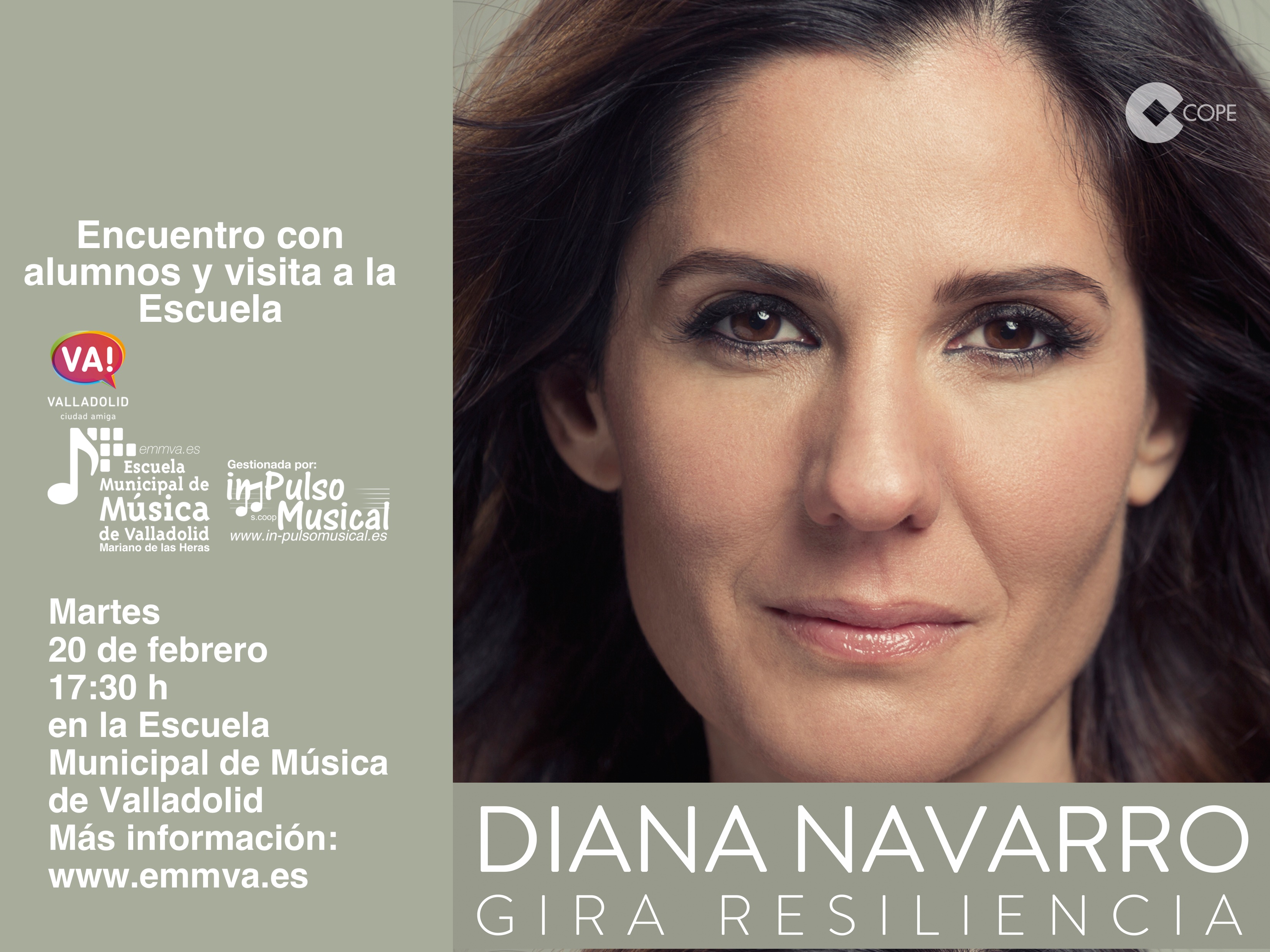 Diana Navarro participará el martes 20 de febrero a las 17:30 horas en un encuentro con alumnos y profesores de la Escuela Municipal de Música "Mariano de las Heras" del Ayuntamiento de Valladolid, con motivo del concierto que ofrecerá en el Teatro Calderón al día siguiente de la mano de Cadena Cope.