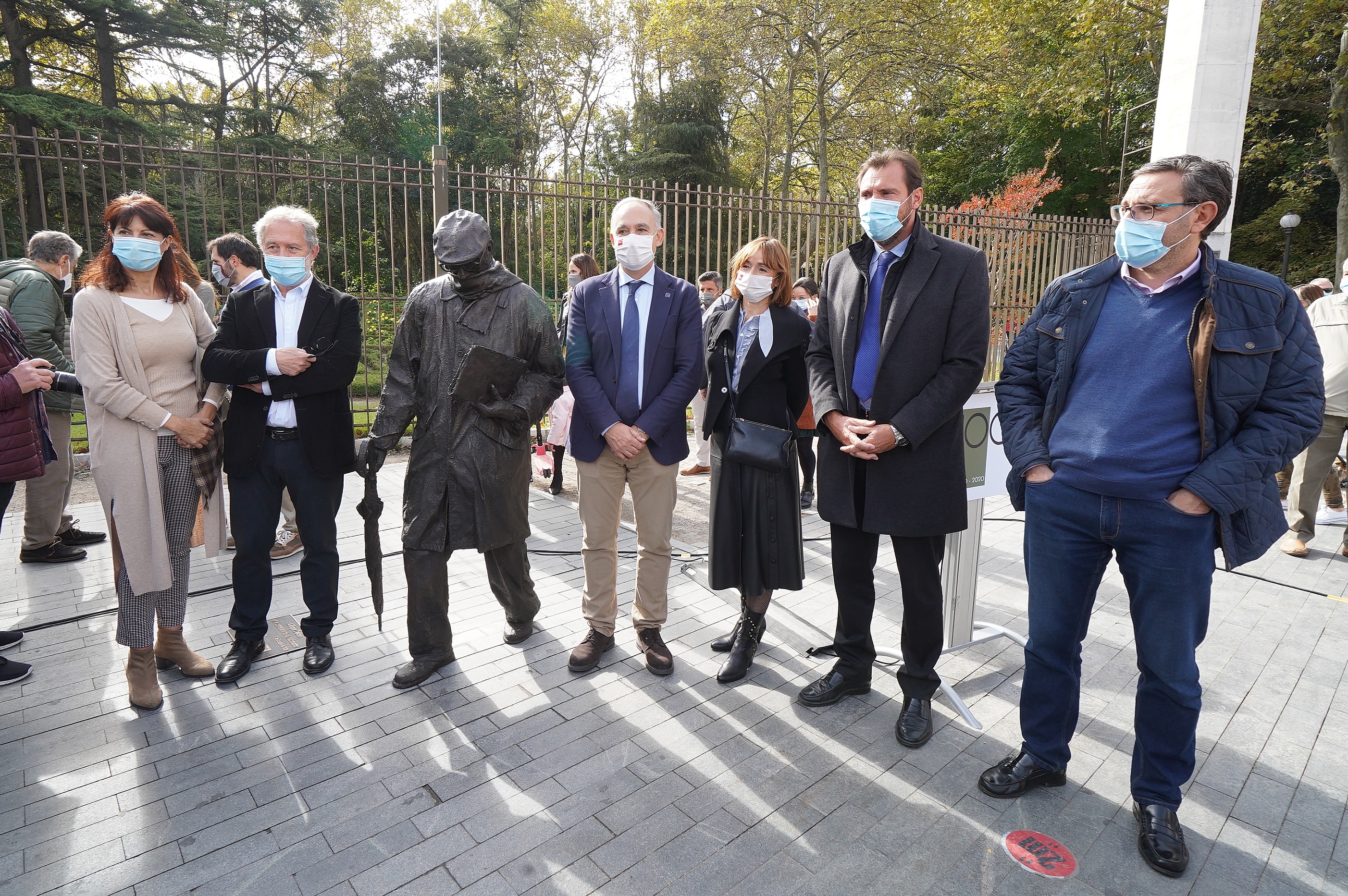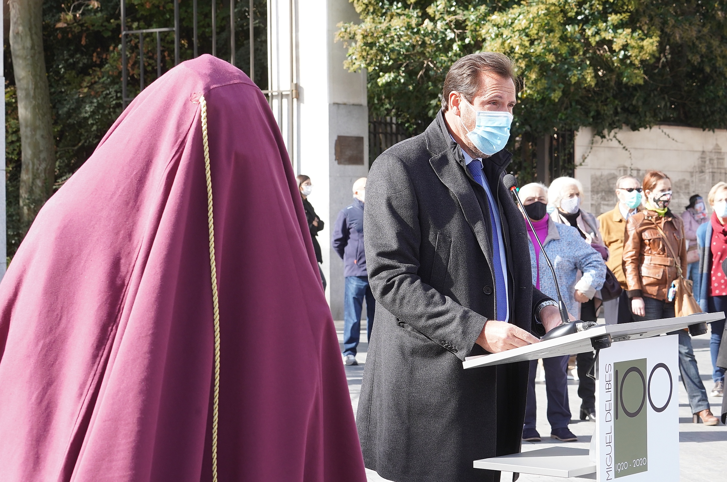 Muchos son los vecinos de Valladolid que recuerdan con cariño cuando, en la Acera de Recoletos o en el Campo Grande, se cruzaban con don Miguel en su paseo diario, en el que iba ensimismado en sus cavilaciones, o ya, en sus últimos años, caminaba en compañía de algunos de sus hijos. A partir de hoy, van a poder revivir esa sensación de encontrarse con Delibes, y ello va a ser posible merced a la escultura que representa al escritor y que se va a inaugurar en breves momentos. Gracias por hacerlo posible a la Junta de Castilla y León y también al autor de esta magnífica obra, al vallisoletano Eduardo Cuadrado. No descubro nada nuevo al afirmar que Eduardo Cuadrado es un gran artista muy reconocido en nuestra ciudad, no en vano a su taller se deben diversas obras que están repartidas por calles y plazas de Valladolid, como son, y espero no olvidarme de ninguna, "El Fotógrafo", instalado aquí cerca, en el interior del Campo Grande, el "Homenaje al Voluntariado Social", en la plaza de España, "El Comediante", en la Plaza Martí y Monsó, y "Hombre arrastrando máscaras", que está ubicada en los jardines del edificio de la Diputación en la calle Ramón y Cajal. A ellas se suma a partir de hoy esta figura que representa a Delibes tal y como le recordamos en su andar cotidiano por este mismo lugar.