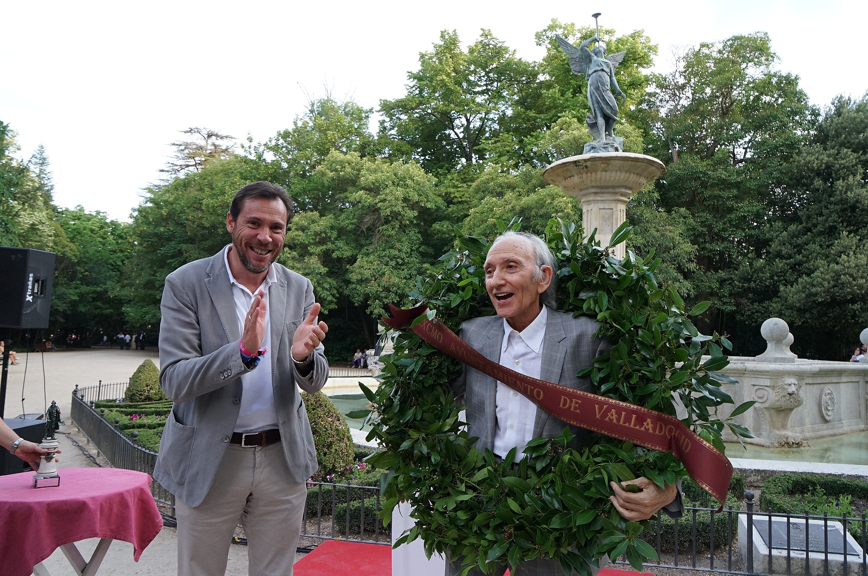 "Mi intervención ha de servir, por lo tanto, para intentar llegar al corazón de Alonso de Santos con un mensaje sincero y contundente de reconocimiento y gratitud. Un mensaje del que los vallisoletanos y las vallisoletanas me han hecho depositario, para que, en su nombre, lo proclame y lo manifieste públicamente esta tarde, al pie de nuestra carismática "Fuente de la Fama". Un día como hoy, 22 de junio, hace exactamente 130 años, en el Palacio de Carlos V de La Alhambra de Granada, la sociedad española "coronó" como poeta nacional del momento a otro de los más grandes letraheridos vallisoletanos de todos los tiempos: José Zorrilla" ha destacado Puente quien ha continuado su discurso diciendo que "Hoy, emulando aquel acontecimiento, la sociedad vallisoletana, con su alcalde a la cabeza y en presencia de las principales entidades e instituciones públicas, culturales y académicas de nuestro entorno, procede a nombrar en este acto, a D. José Luis Alonso de Santos, "Letraherido 2019". Y lo hacemos, tus paisanos lo hacemos, José Luis, con un enorme sentimiento de orgullo, con un sincero reconocimiento y con total agradecimiento, por tu trabajo, tu obra, tu talante humano y ese vitalismo que llevas décadas regalándonos por doquier".