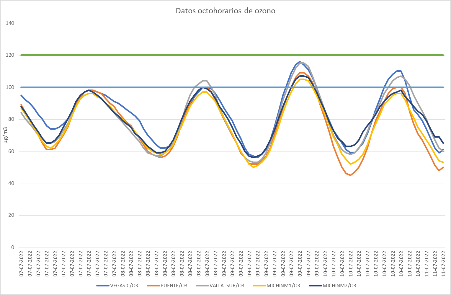 La ola de calor que ha llegado también a Valladolid ha provocado un incremento del ozono como elemento contaminante y de hecho el Servicio de Medio Ambiente informa que se ha superado en las estaciones de medida de la Red de Control de la Contaminación Atmosférica del Ayuntamiento de Valladolid (RCCAVA) el valor de 100 µg/m3 como valor máximo de las medias móviles octohorarias durante tres días consecutivos: 8, 9 y 10 de julio.