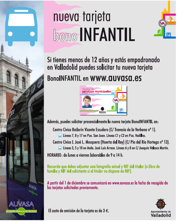 A partir el próximo día 3 de noviembre, los niños y niñas menores de 12 años empadronados en la ciudad de Valladolid podrán solicitar la nueva tarjeta BONO INFANTIL de Auvasa, para poder viajar gratuitamente en el transporte colectivo urbano en todas las líneas y servicios.