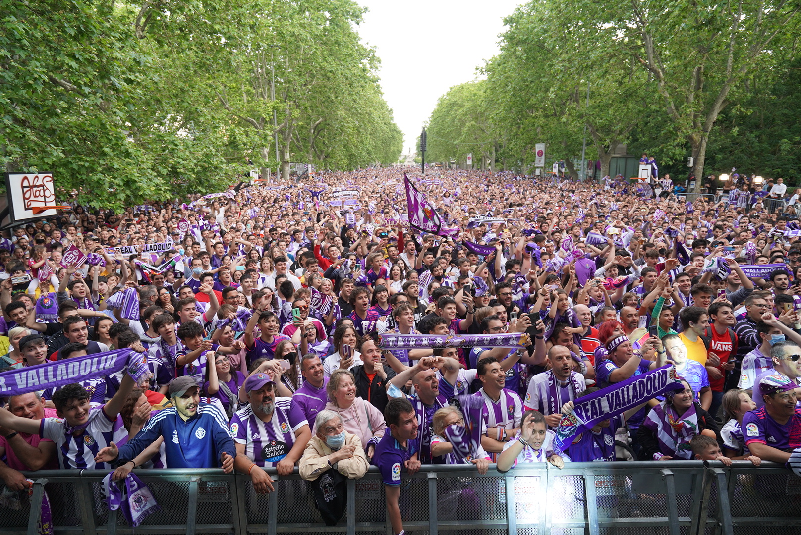 Miles de personas expresan su alegría con el ascenso del Real Valladolid a la élite del fútbol español.