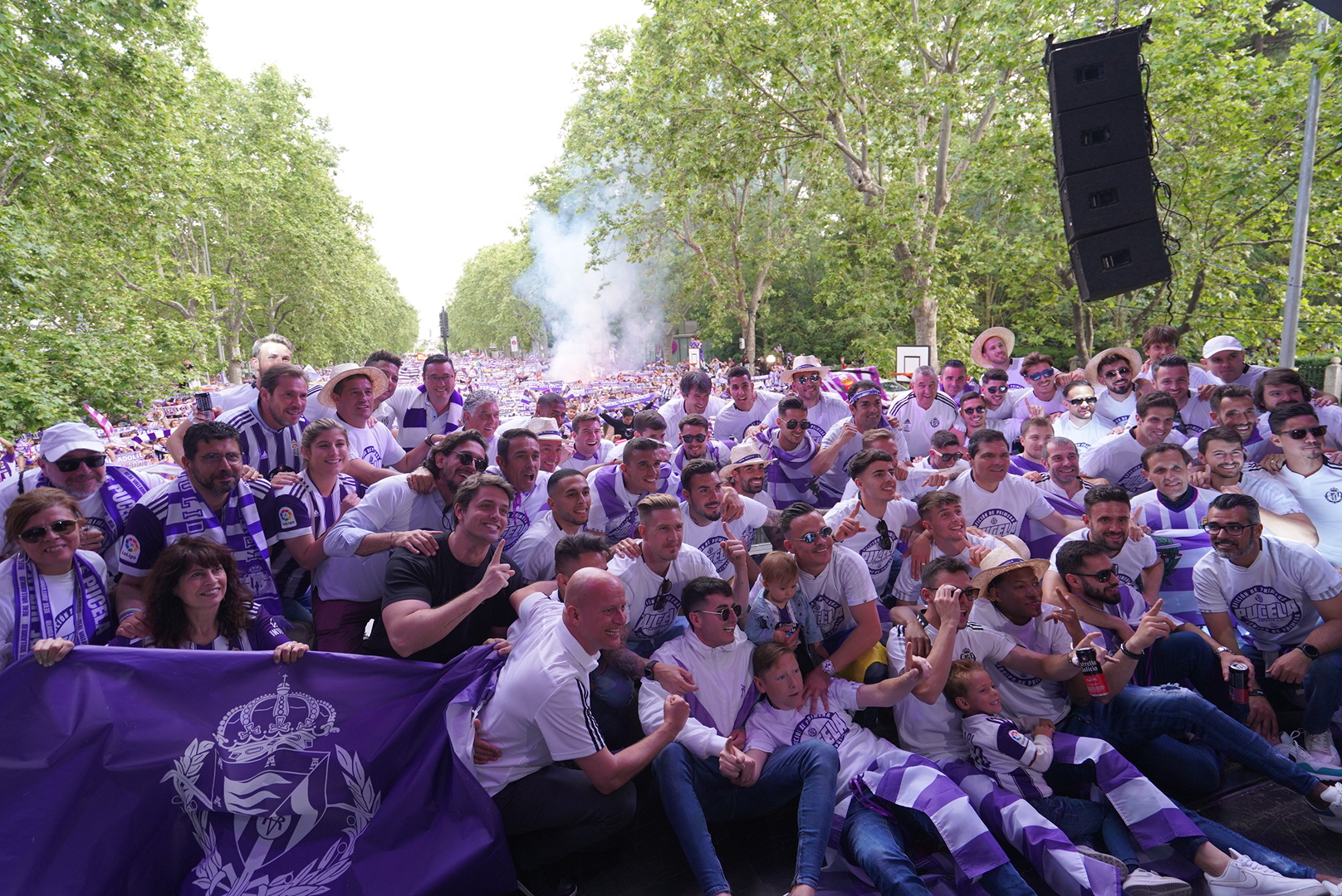 La celebración organizada por el Ayuntamiento de Valladolid en este punto no defraudó a los seguidores del club blanquivioleta porque pudieron corear los nombres -uno a uno- de todos los integrantes de la plantilla que ha culminado una temporada excepcional con la goleada 3-0 al Huesca en el encuentro de ayer domingo en el Estadio José Zorrilla.
