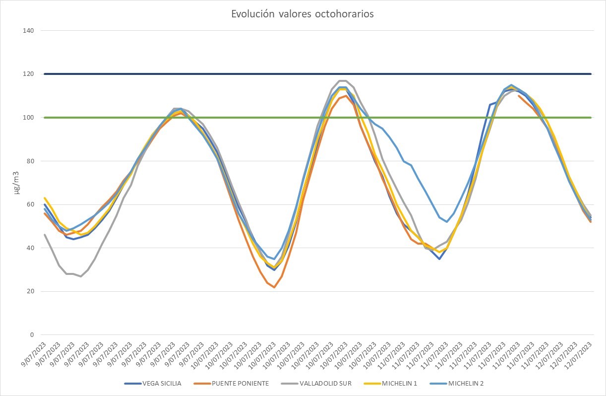 En la siguiente tabla se muestran los valores máximos de las medias móviles octohorarias de ozono en las estaciones de la RCCAVA de los días 9, 10 y 11 de julio.
