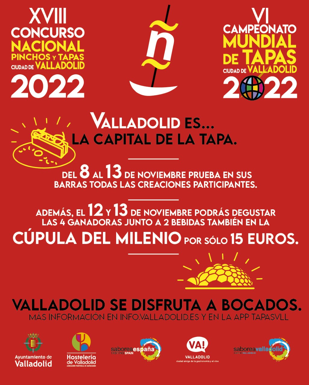 Valladolid se prepara un año más para convertirse en capital mundial de la tapa. Del 7 al 9 de noviembre la Cúpula del Milenio albergará el XVIII Concurso Nacional de Pinchos y Tapas y el VI Campeonato Mundial de Tapas. Todas las creaciones que se presentan a concurso podrán probarse entre el 8 y el 13 de noviembre en el Festival Internacional de la Tapa. 45 establecimientos hosteleros se han hermanado con los participantes de los dos certámenes para ofrecer al público los sesenta bocados. La información de todos los establecimientos hosteleros donde probar las tapas se puede encontrar en www.info.valladolid.esEste enlace se abrirá en una ventana nueva y en la app TAPASVLL.