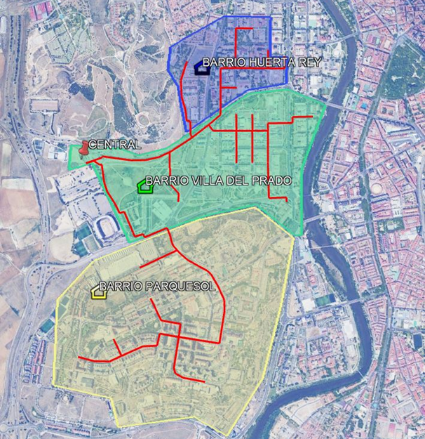 Desde la central de generación partirán dos ramales bitubulares de canalizaciones de transporte de calor urbano, uno para el barrio de Parquesol y otro para los barrios Villa del Prado y Huerta del Rey.