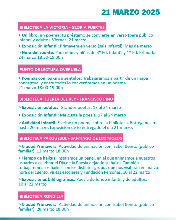 Programación de actividades de celebración del Día Mundial de la Poesía en las Bibliotecas Municipales:
