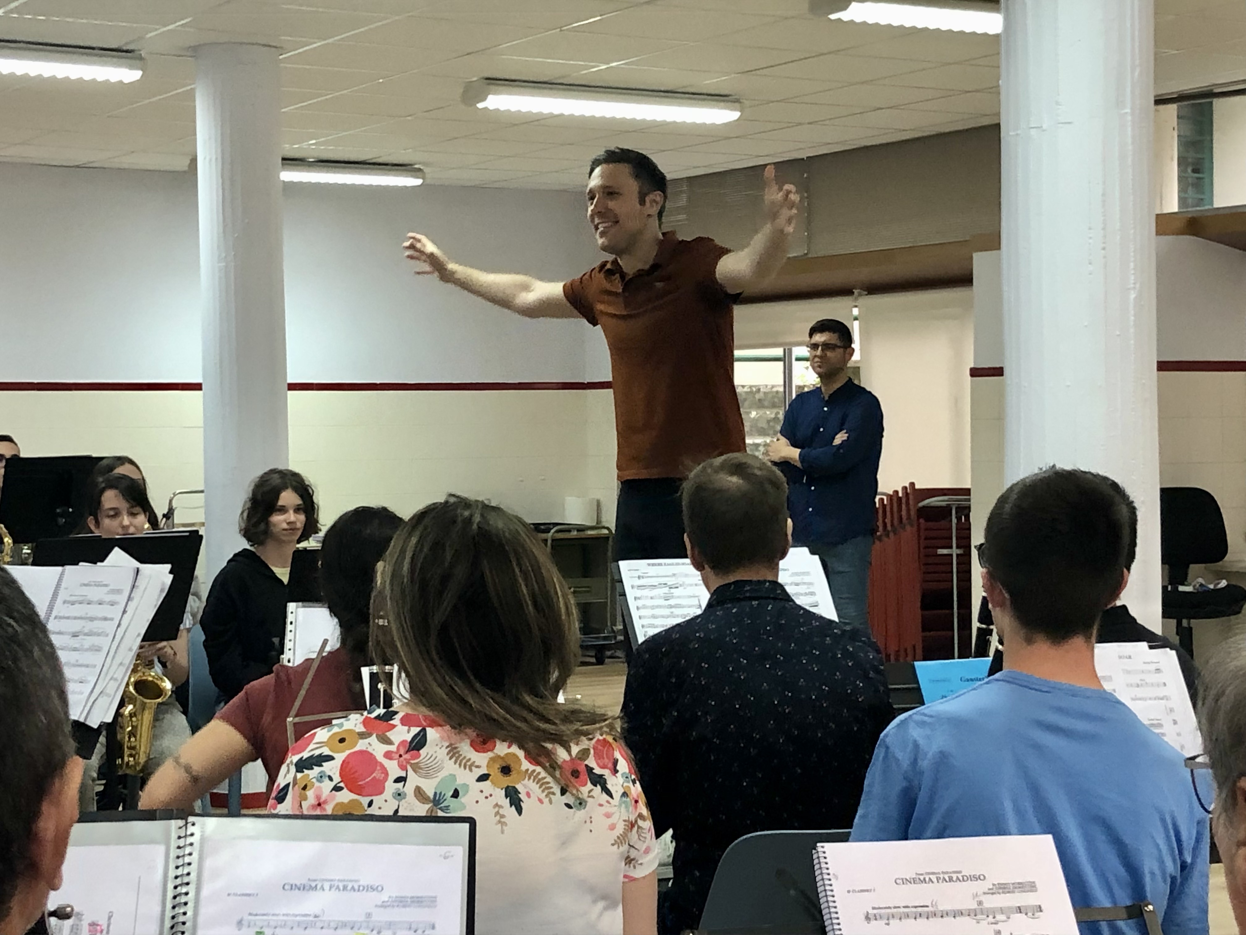 En esta segunda ubicación, es donde se encuentra la nueva sala de ensayo de la Banda, donde se ha celebrado un encuentro con sus componentes que han tenido oportunidad de compartir experiencias y ensayo con Roberto González - Monjas.