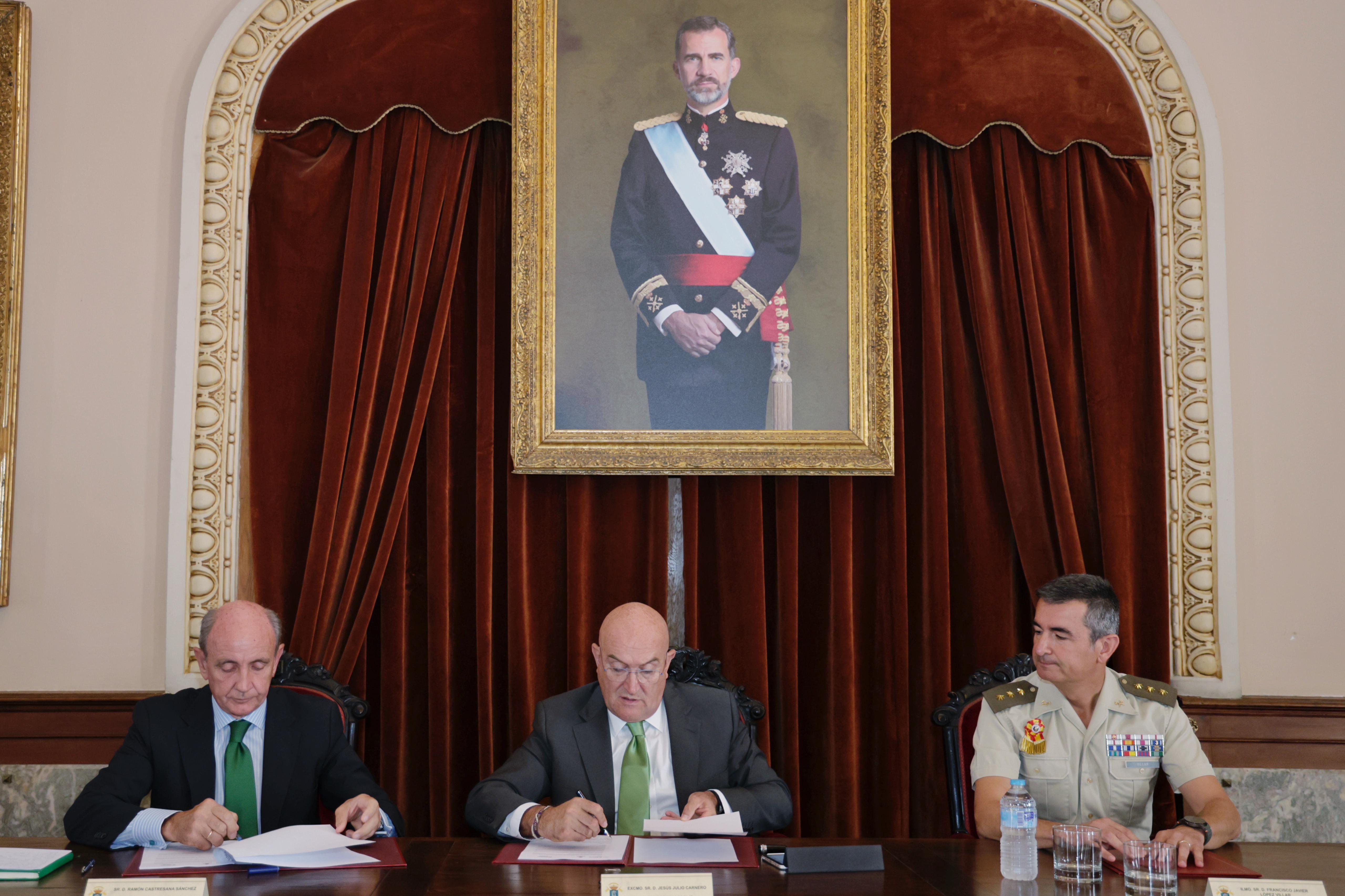 El alcalde de Valladolid, Jesús Julio Carnero, y el director de la Fundación Iberdrola EspañaEste enlace se abrirá en una ventana nueva., Ramón Castresana, han suscrito esta mañana, en presencia del coronel director de la Academia de Caballería, Francisco Javier López Villar, y el delegado de Iberdrola en Castilla y León, Miguel Calvo, un convenio de colaboración para dotar de una nueva iluminación ornamental exterior la Academia de Caballería, uno de los edificios más representativos y majestuosos de la capital vallisoletana.
